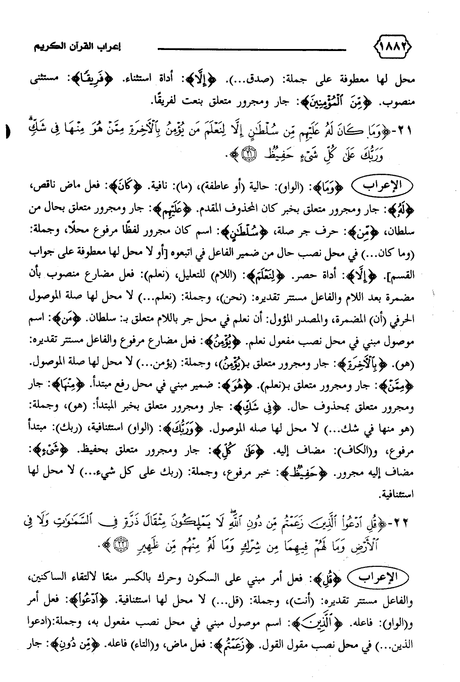 الإعراب {وَما}: (الواو): حالية (أو عاطفة)، (ما): نافية. {كانَ}: فعل ماض ناقص، {لَهُ}: جار ومجرور متعلق بخبر كان المحذوف المقدم. {عَلَيْهِمْ}: جار ومجرور متعلق بحال من سلطان، {مِنْ}: حرف جر صلة، {سُلْطانٍ}: اسم كان مجرور لفظا مرفوع محلا، وجملة: