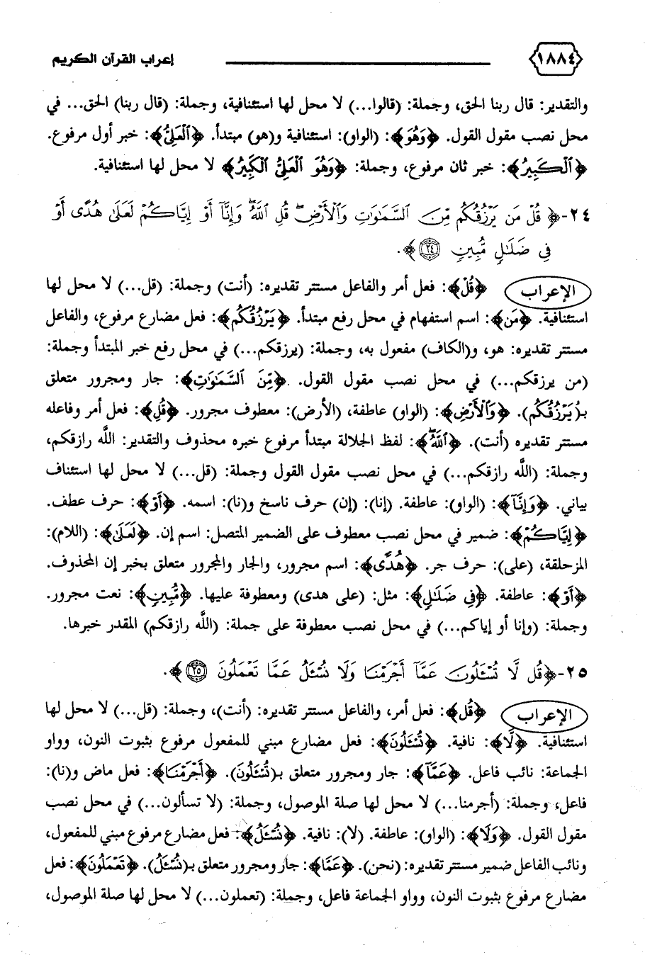 (من يرزقكم ... ) في محل نصب مقول القول. {مِنَ السَّماواتِ}: جار ومجرور متعلق ب (يرزقكم). {وَالْأَرْضِ}: (الواو) عاطفة، (الأرض): معطوف مجرور. {قُلْ}: فعل أمر وفاعله مستتر تقديره (أنت). {اللهُ}: لفظ الجلالة مبتدأ مرفوع خبره محذوف والتقدير: الله رازقكم، وجملة: (الله رازقكم ... ) في محل نصب مقول القول وجملة: (قل ... ) لا محل لها استئناف بياني. {وَإِنّا}: (الواو): عاطفة. (إنا): (إن) حرف ناسخ و (نا): اسمه. {أَوْ}: حرف عطف.