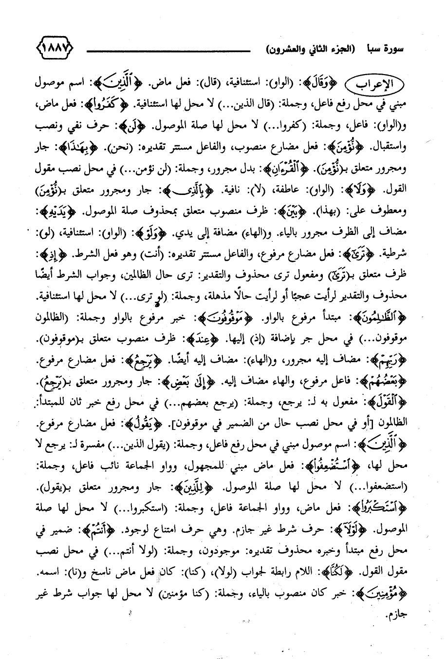الإعراب {وَقالَ}: (الواو): استئنافية، (قال): فعل ماض. {الَّذِينَ}: اسم موصول مبني في محل رفع فاعل، وجملة: (قال الذين ... ) لا محل لها استئنافية. {كَفَرُوا}: فعل ماض، و (الواو): فاعل، وجملة: (كفروا ... ) لا محل لها صلة الموصول. {لَنْ}: حرف نفي ونصب واستقبال. {نُؤْمِنَ}: فعل مضارع منصوب، والفاعل مستتر تقديره: (نحن). {بِهذَا}: جار ومجرور متعلق ب (نؤمن). {الْقُرْآنِ}: بدل مجرور، وجملة: (لن نؤمن ... ) في محل نصب مقول القول. {وَلا}: (الواو): عاطفة، (لا): نافية. {بِالَّذِي}: جار ومجرور متعلق ب (نؤمن) ومعطوف على: (بهذا). {بَيْنَ}: ظرف منصوب متعلق بمحذوف صلة الموصول. {يَدَيْهِ}:
