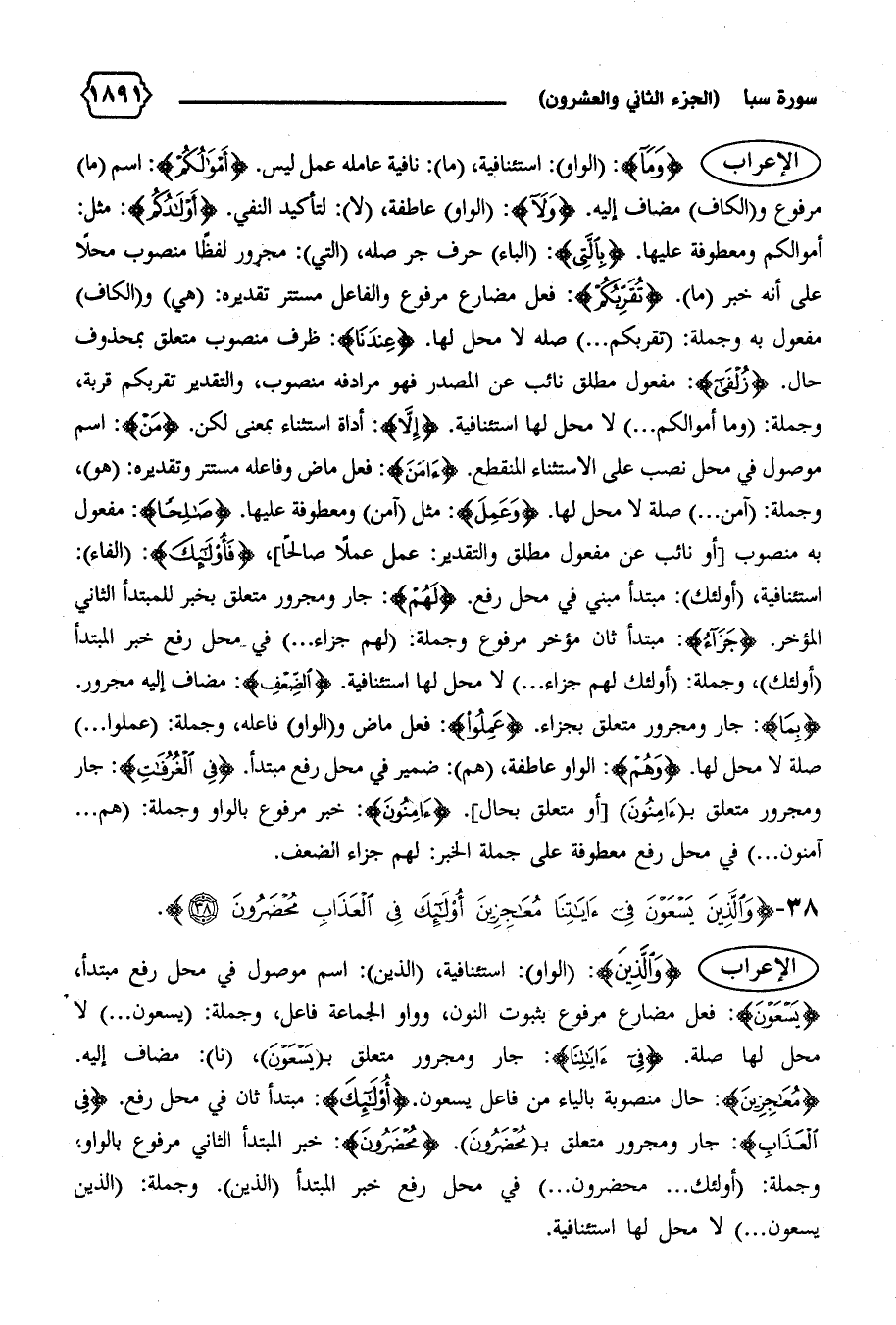 أموالكم ومعطوفة عليها. {بِالَّتِي}: (الباء حرف جر صلة، (التي): مجرور لفظا منصوب محلا على أنه خبر (ما). {تُقَرِّبُكُمْ}: فعل مضارع مرفوع والفاعل مستتر تقديره: (هي) و (الكاف) مفعول به وجملة: (تقربكم ... ) صله لا محل لها. {عِنْدَنا}: ظرف منصوب متعلق بمحذوف حال. {زُلْفى}: مفعول مطلق نائب عن المصدر فهو مرادفه منصوب، والتقدير تقربكم قربة، وجملة: (وما أموالكم ... ) لا محل لها استئنافية. {إِلاّ}: أداة استثناء بمعنى لكن. {مَنْ}: اسم موصول في محل نصب على الاستثناء المنقطع. {آمَنَ}: فعل ماض وفاعله مستتر وتقديره: (هو)، وجملة: (آمن ... ) صلة لا محل لها. {وَعَمِلَ}: مثل (آمن) ومعطوفة عليها. {صالِحاً}: مفعول به منصوب [أو نائب عن مفعول مطلق والتقدير: عمل عملا صالحا]، {فَأُولئِكَ}: (الفاء):