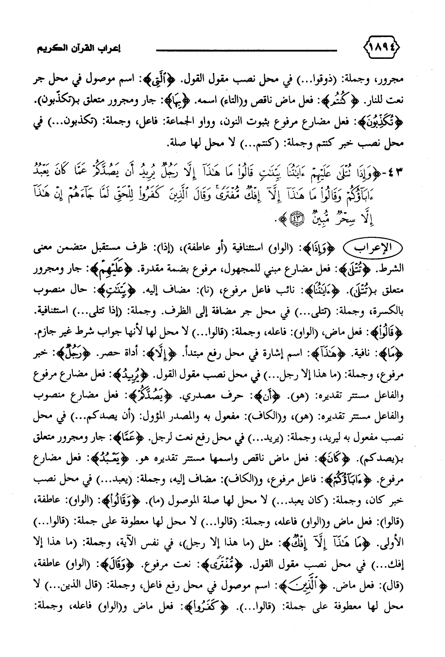 {ما}: نافية. {هذا}: اسم إشارة في محل رفع مبتدأ. {إِلاّ}: أداة حصر. {رَجُلٌ}: خبر مرفوع، وجملة: (ما هذا إلا رجل ... ) في محل نصب مقول القول. {يُرِيدُ}: فعل مضارع مرفوع والفاعل مستتر تقديره: (هو)، {أَنْ}: حرف مصدري. {يَصُدَّكُمْ}: فعل مضارع منصوب والفاعل مستتر تقديره: (هو)، و (الكاف): مفعول به والمصدر المؤول: (أن يصدكم ... ) في محل نصب مفعول به ليريد، وجملة: (يريد ... ) في محل رفع نعت لرجل. {عَمّا}: جار ومجرور متعلق ب (يصدكم). {كانَ}: فعل ماض ناقص واسمها مستتر تقديره هو. {يَعْبُدُ}: فعل مضارع مرفوع. {آباؤُكُمْ}: فاعل مرفوع، و (الكاف): مضاف إليه، وجملة: (يعبد ... ) في محل نصب خبر كان، وجملة: (كان يعبد ... ) لا محل لها صلة الموصول (ما). {وَقالُوا}: (الواو): عاطفة، (قالوا): فعل ماض و (الواو) فاعله، وجملة: (قالوا ... ) لا محل لها معطوفة على جملة: (قالوا ... ) الأولى. {ما هذا إِلاّ إِفْكٌ}: مثل (ما هذا إلا رجل)، في نفس الآية، وجملة: (ما هذا إلا إفك ... ) في محل نصب مقول القول. {مُفْتَرىً}: نعت مرفوع. {وَقالَ}: (الواو) عاطفة، (قال): فعل ماض. {الَّذِينَ}: اسم موصول في محل رفع فاعل، وجملة: (قال الذين ... ) لا محل لها معطوفة على جملة: (قالوا ... ). {كَفَرُوا}: فعل ماض و (الواو) فاعله، وجملة: