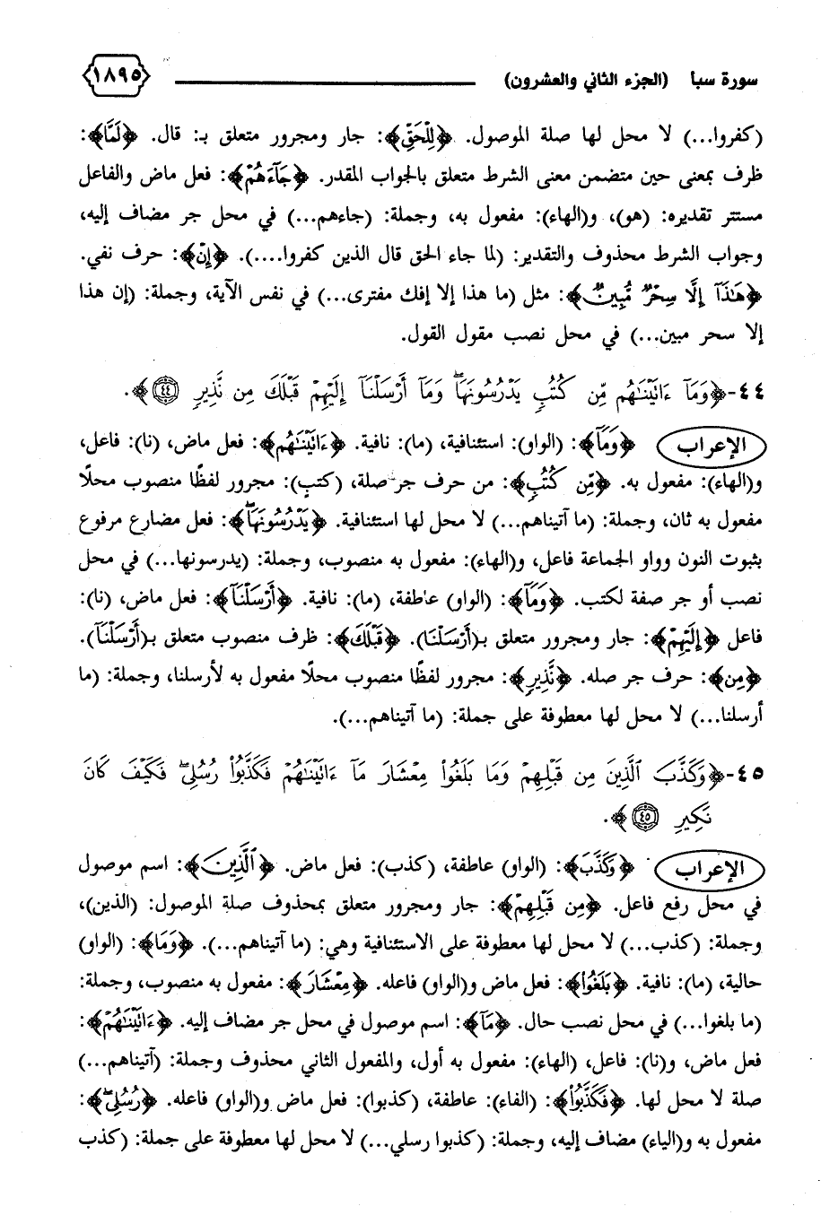 الإعراب {وَما}: (الواو): استئنافية، (ما): نافية. {آتَيْناهُمْ}: فعل ماض، (نا): فاعل، و (الهاء): مفعول به. {مِنْ كُتُبٍ}: من حرف جر صلة، (كتب): مجرور لفظا منصوب محلا مفعول به ثان، وجملة: (ما آتيناهم ... ) لا محل لها استئنافية. {يَدْرُسُونَها}: فعل مضارع مرفوع بثبوت النون وواو الجماعة فاعل، و (الهاء): مفعول به منصوب، وجملة: (يدرسونها ... ) في محل نصب أو جر صفة لكتب. {وَما}: (الواو) عاطفة، (ما): نافية. {أَرْسَلْنا}: فعل ماض، (نا):