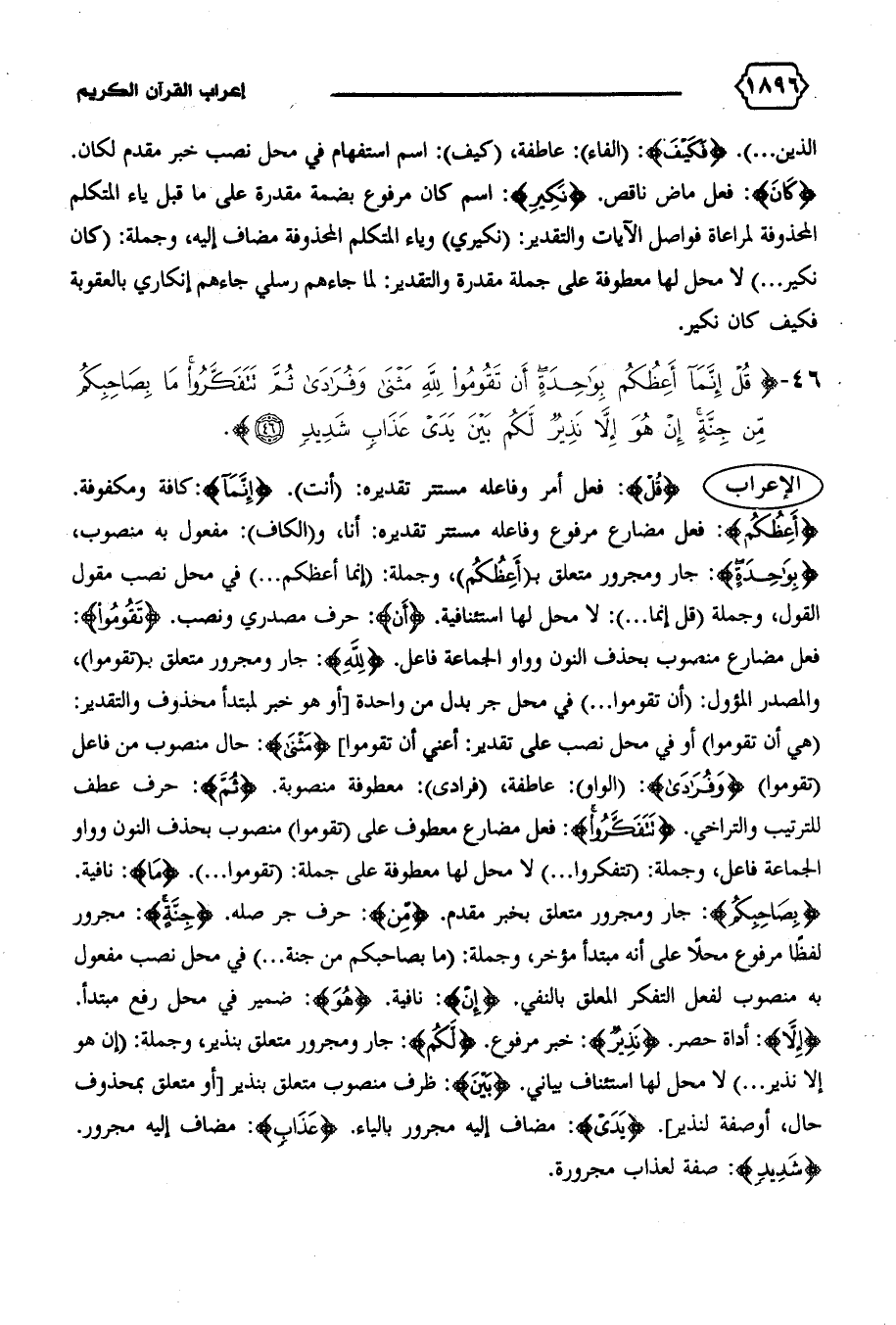 {قُلْ إِنَّما أَعِظُكُمْ بِواحِدَةٍ أَنْ تَقُومُوا لِلّهِ مَثْنى وَفُرادى ثُمَّ تَتَفَكَّرُوا ما بِصاحِبِكُمْ مِنْ جِنَّةٍ إِنْ هُوَ إِلاّ نَذِيرٌ لَكُمْ بَيْنَ يَدَيْ عَذابٍ شَدِيدٍ (٤٦)}