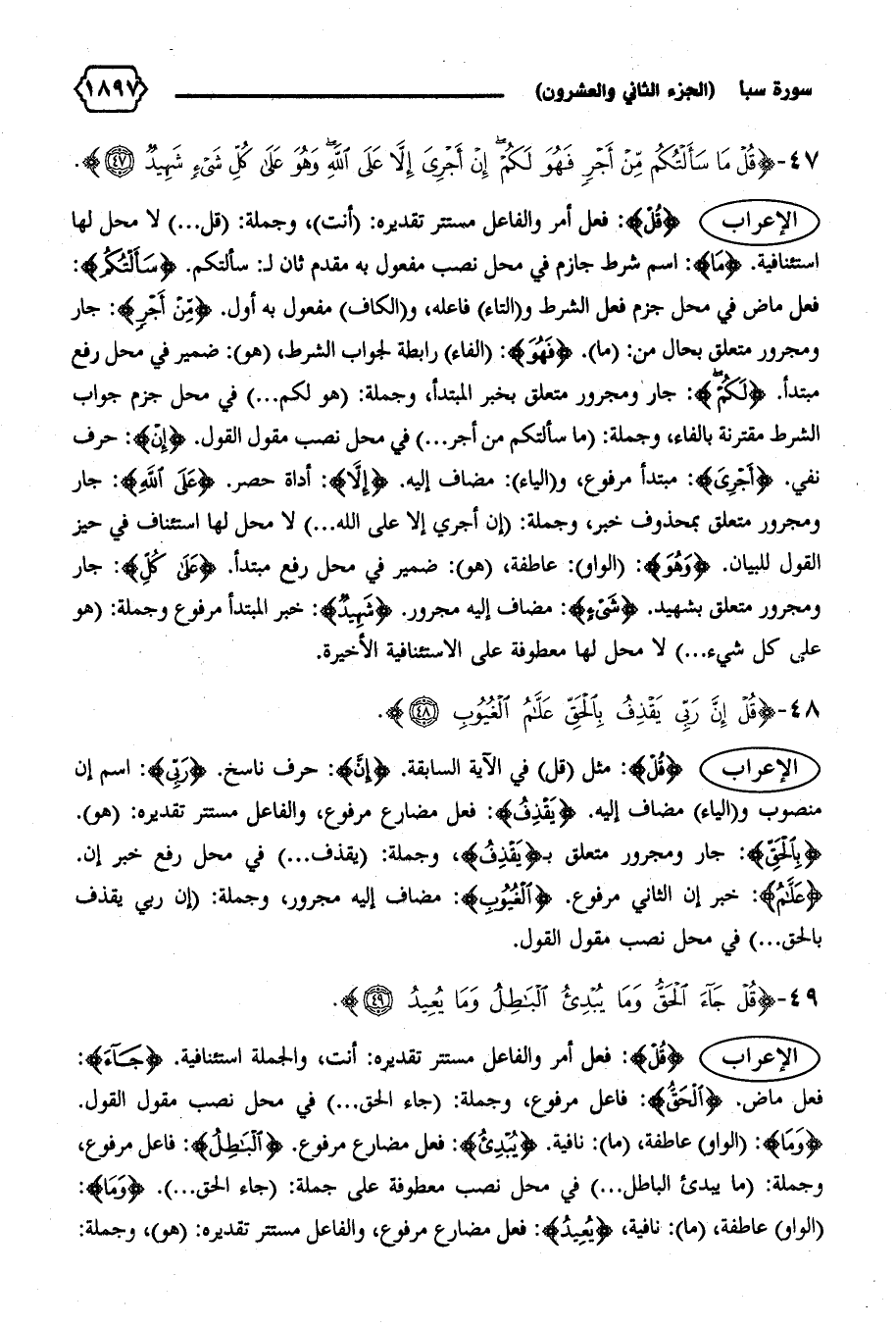 الإعراب {قُلْ}: مثل (قل) في الآية السابقة. {إِنَّ}: حرف ناسخ. {رَبِّي}: اسم إن منصوب و (الياء) مضاف إليه. {يَقْذِفُ}: فعل مضارع مرفوع، والفاعل مستتر تقديره: (هو).
