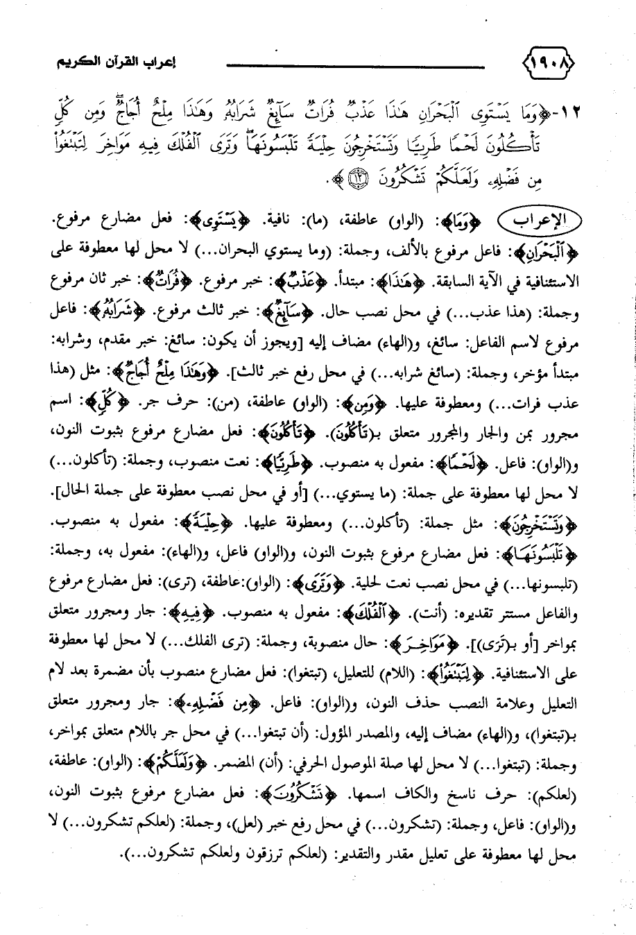 مبتدأ مؤخر، وجملة: (سائغ شرابه ... ) في محل رفع خبر ثالث]. {وَهذا مِلْحٌ أُجاجٌ}: مثل (هذا عذب فرات ... ) ومعطوفة عليها. {وَمِنْ}: (الواو) عاطفة، (من): حرف جر. {كُلٍّ}: اسم مجرور بمن والجار والمجرور متعلق ب (تأكلون). {تَأْكُلُونَ}: فعل مضارع مرفوع بثبوت النون، و (الواو): فاعل. {لَحْماً}: مفعول به منصوب. {طَرِيًّا}: نعت منصوب، وجملة: (تأكلون ... ) لا محل لها معطوفة على جملة: (ما يستوي ... ) [أو في محل نصب معطوفة على جملة الحال].