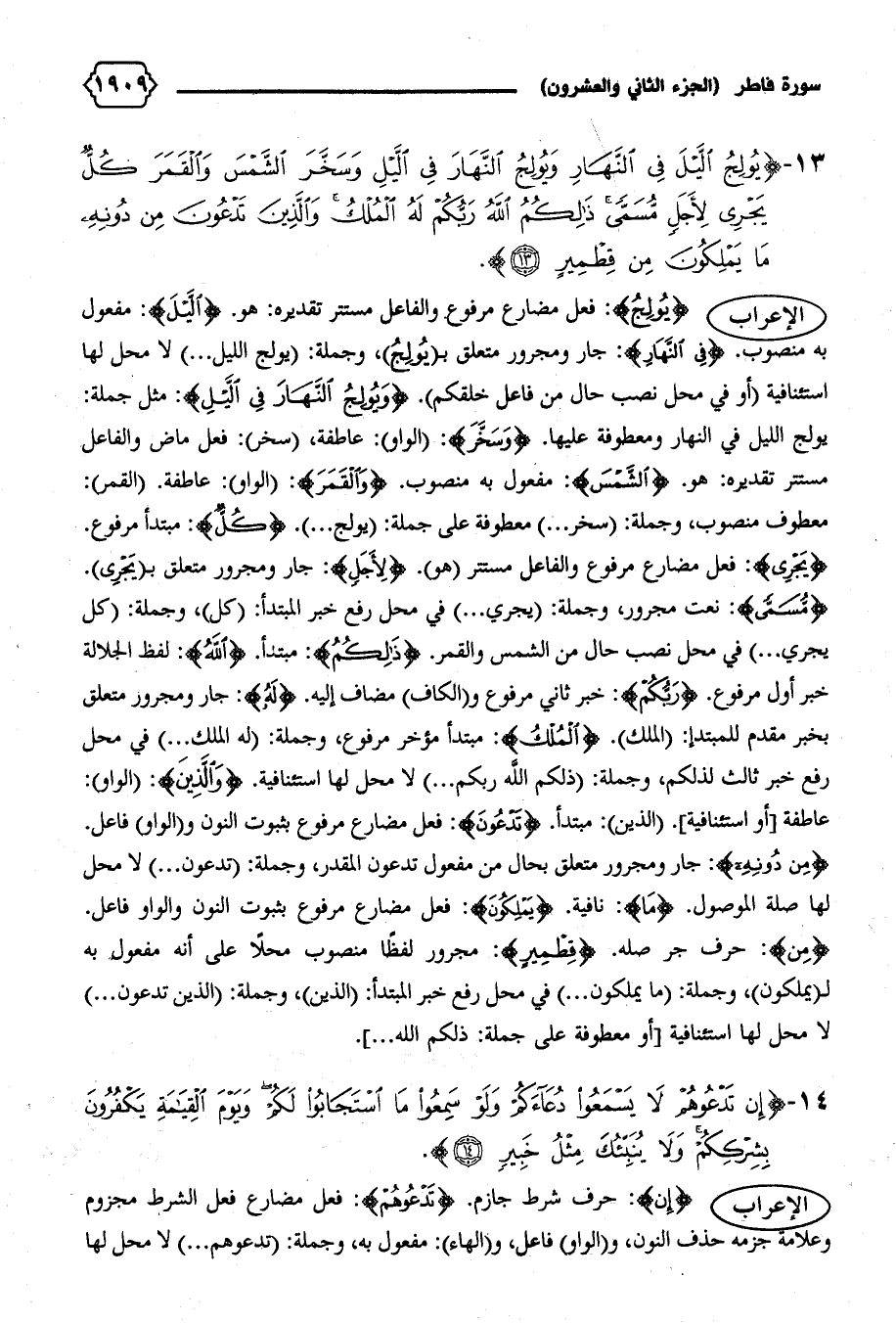 {يُولِجُ اللَّيْلَ فِي النَّهارِ وَيُولِجُ النَّهارَ فِي اللَّيْلِ وَسَخَّرَ الشَّمْسَ وَالْقَمَرَ كُلٌّ يَجْرِي لِأَجَلٍ مُسَمًّى ذلِكُمُ اللهُ رَبُّكُمْ لَهُ الْمُلْكُ وَالَّذِينَ تَدْعُونَ مِنْ دُونِهِ ما يَمْلِكُونَ مِنْ قِطْمِيرٍ (١٣)}