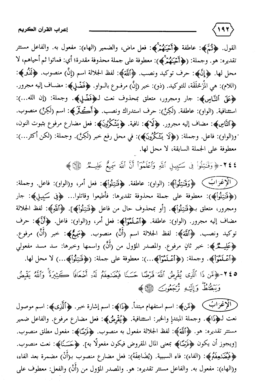 {قاتِلُوا}: معطوفة على جملة محذوفة تقديرها: فأطيعوا وقاتلوا ... {فِي سَبِيلِ}: جار ومجرور، متعلق ب {قاتِلُوا}. [أو بمحذوف حال من فاعل {قاتِلُوا}]. {اللهِ}: لفظ الجلالة مضاف إليه مجرور. (الواو): عاطفة. {اِعْلَمُوا}: فعل أمر، و (الواو): فاعل. {أَنَّ}: حرف توكيد ونصب. {اللهِ}: لفظ الجلالة اسم (أنّ) منصوب. {سَمِيعٌ}: خبر (أنّ) مرفوع.