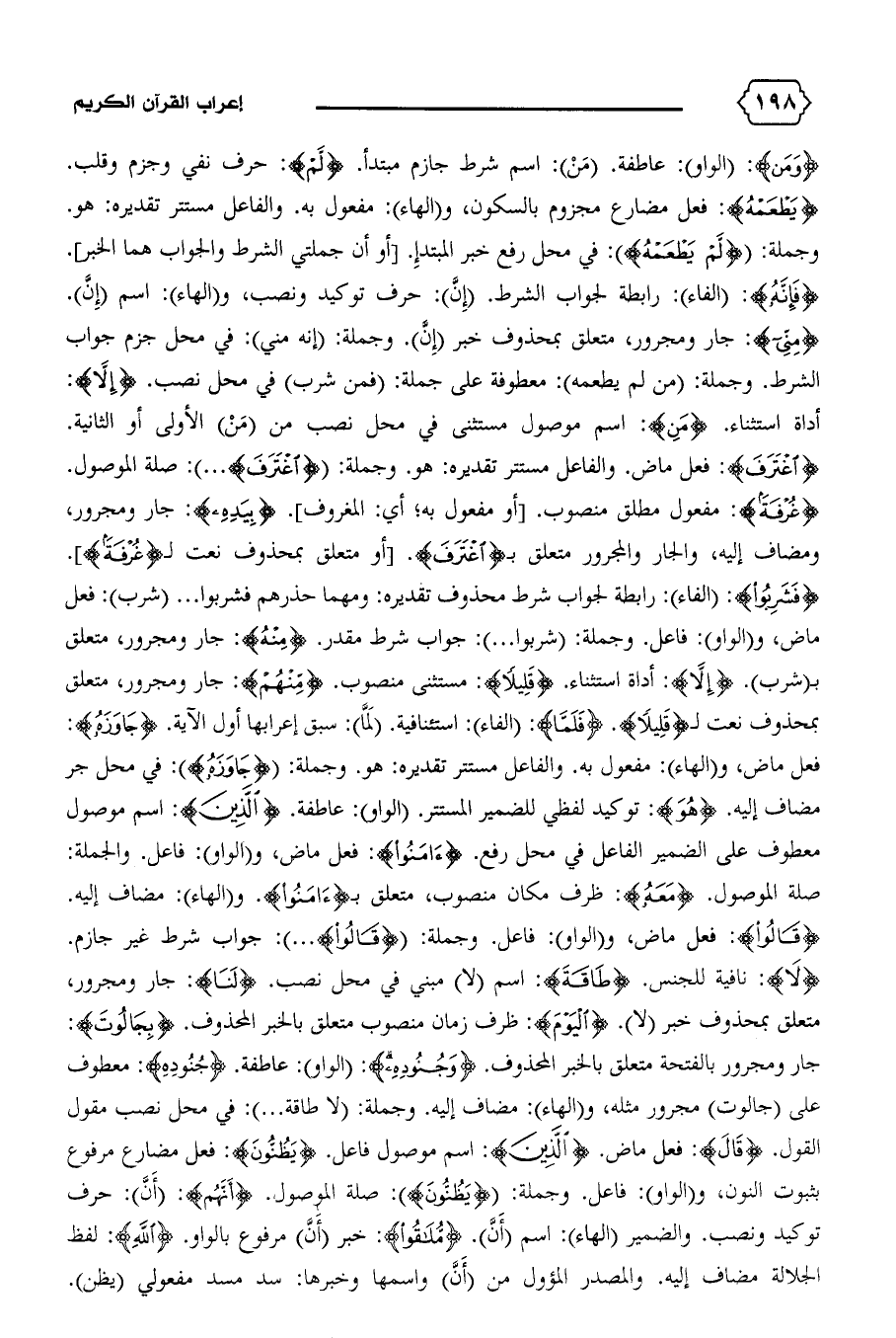 {فَشَرِبُوا}: (الفاء): رابطة لجواب شرط محذوف تقديره: ومهما حذرهم فشربوا ... (شرب): فعل ماض، و (الواو): فاعل. وجملة: (شربوا ... ): جواب شرط مقدر. {مِنْهُ}: جار ومجرور، متعلق ب (شرب). {إِلاّ}: أداة استثناء. {قَلِيلاً}: مستثنى منصوب. {مِنْهُمْ}: جار ومجرور، متعلق بمحذوف نعت ل {قَلِيلاً}. {فَلَمّا}: (الفاء): استئنافية. (لمّا): سبق إعرابها أول الآية. {جاوَزَهُ}:
