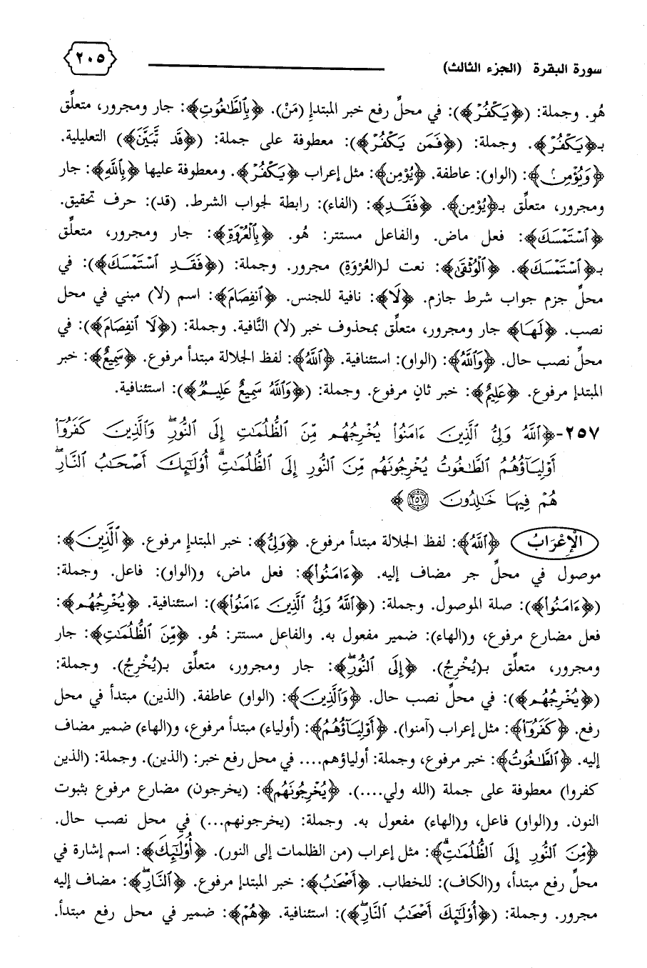 {يُخْرِجُهُمْ}: في محلّ نصب حال. {وَالَّذِينَ}: (الواو) عاطفة. (الذين) مبتدأ في محل رفع. {كَفَرُوا}: مثل إعراب (آمنوا). {أَوْلِياؤُهُمُ}: (أولياء) مبتدأ مرفوع، و (الهاء) ضمير مضاف إليه. {الطّاغُوتُ}: خبر مرفوع، وجملة: أولياؤهم .... في محل رفع خبر: (الذين).وجملة: (الذين كفروا) معطوفة على جملة (الله ولي .... ). {يُخْرِجُونَهُمْ}: (يخرجون) مضارع مرفوع بثبوت النون. و (الواو) فاعل، و (الهاء) مفعول به. وجملة: (يخرجونهم ... ) في محل نصب حال.