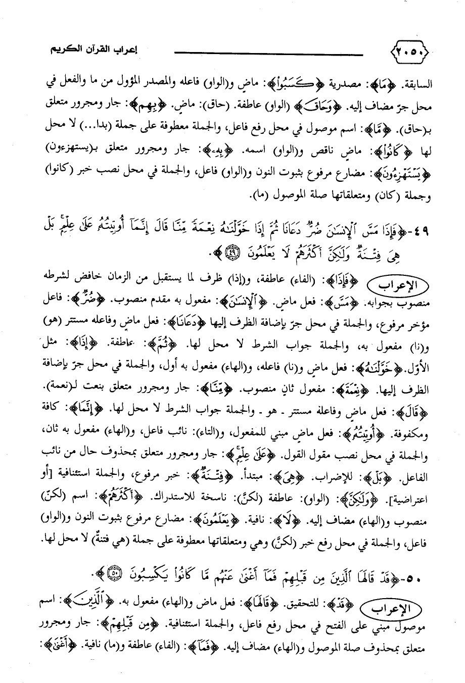 الإعراب {فَإِذا}: (الفاء) عاطفة، و (إذا) ظرف لما يستقبل من الزمان خافض لشرطه منصوب بجوابه. {مَسَّ}: فعل ماض. {الْإِنْسانَ}: مفعول به مقدم منصوب. {ضُرٌّ}: فاعل مؤخر مرفوع، والجملة في محل جرّ بإضافة الظرف إليها {دَعانا}: فعل ماض وفاعله مستتر (هو) و (نا) مفعول به، والجملة جواب الشرط لا محل لها. {ثُمَّ}: عاطفة. {إِذا}: مثل الأوّل. {خَوَّلْناهُ}: فعل ماض و (نا) فاعله، و (الهاء) مفعول به أول، والجملة في محل جرّ بإضافة الظرف إليها. {نِعْمَةً}: مفعول ثان منصوب. {مِنّا}: جار ومجرور متعلق بنعت ل (نعمة).
