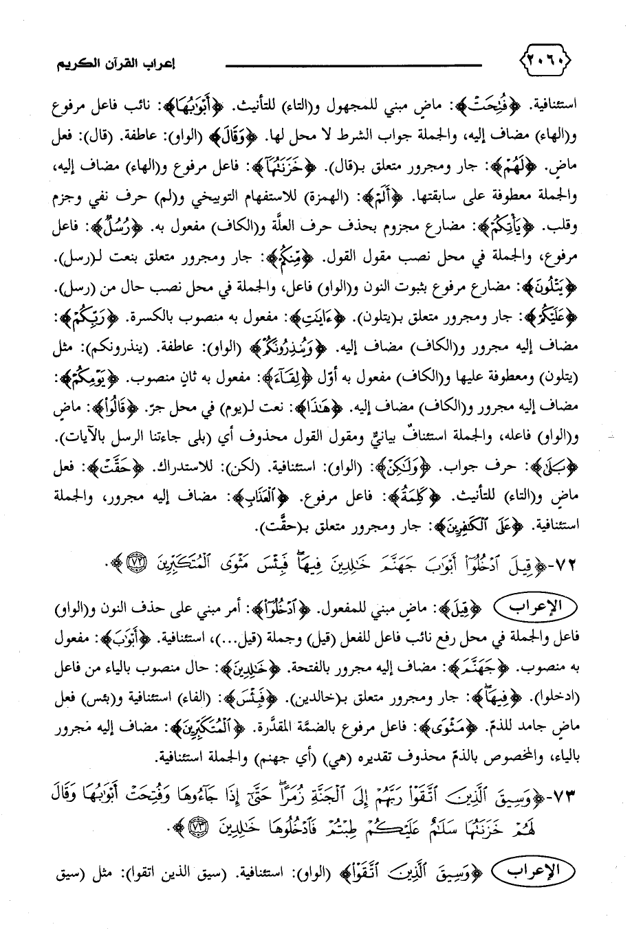 الإعراب {قِيلَ}: ماض مبني للمفعول. {اُدْخُلُوا}: أمر مبني على حذف النون و (الواو) فاعل والجملة في محل رفع نائب فاعل للفعل (قيل) وجملة (قيل ... )، استئنافية. {أَبْوابَ}: مفعول به منصوب. {جَهَنَّمَ}: مضاف إليه مجرور بالفتحة. {خالِدِينَ}: حال منصوب بالياء من فاعل (ادخلوا). {فِيها}: جار ومجرور متعلق ب (خالدين). {فَبِئْسَ}: (الفاء) استئنافية و (بئس) فعل ماض جامد للذمّ. {مَثْوَى}: فاعل مرفوع بالضمّة المقدّرة. {الْمُتَكَبِّرِينَ}: مضاف إليه مجرور بالياء، والمخصوص بالذمّ محذوف تقديره (هي) (أي جهنم) والجملة استئنافية.
