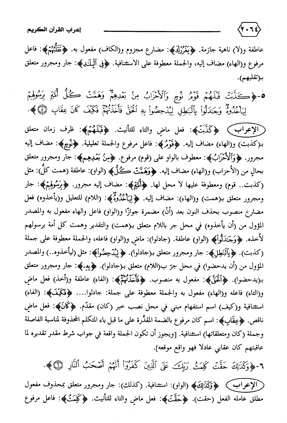 الإعراب {كَذَّبَتْ}: فعل ماض والتاء للتأنيث. {قَبْلَهُمْ}: ظرف زمان متعلق ب (كذبت) والهاء) مضاف إليه. {قَوْمُ}: فاعل مرفوع والجملة تعليلية. {نُوحٍ}: مضاف إليه مجرور. {وَالْأَحْزابُ}: معطوف بالواو على (قوم) مرفوع. {مِنْ بَعْدِهِمْ}: جار ومجرور متعلق بحال من (الأحزاب) و (الهاء) مضاف إليه. {وَهَمَّتْ كُلُّ} (الواو): عاطفة (همت كلّ): مثل (كذبت .. قوم) ومعطوفة عليها لا محل لها. {أُمَّةٍ}: مضاف إليه مجرور. {بِرَسُولِهِمْ}: جار ومجرور متعلق ب (همت) و (الهاء): مضاف إليه. {لِيَأْخُذُوهُ}: (اللام) للتعليل و (يأخذوه) فعل مضارع منصوب بحذف النون بعد (أن) مضمرة جوازا و (الواو) فاعل والهاء مفعول به والمصدر المؤول من (أن يأخذوه) في محل جر باللام متعلق ب (همت) والتقدير وهمت كل أمة برسولهم لأخذه. {وَجادَلُوا} (الواو) عاطفة. (جادلوا): ماض و (الواو) فاعله، والجملة معطوفة على جملة (كذبت). {بِالْباطِلِ}: جار ومجرور متعلق ب (جادلوا). {لِيُدْحِضُوا}: مثل (ليأخذوه ... ) والمصدر المؤول من (أن يدحضوا) في محل جرّ ب (اللام) متعلق ب (جادلوا). {بِهِ}: جار ومجرور متعلق ب (يدحضوا). {الْحَقَّ}: مفعول به منصوب. {فَأَخَذْتُهُمْ}: (الفاء) عاطفة و (أخذ) فعل ماض و (التاء) فاعله و (الهاء) مفعول به والجملة معطوفة على جملة: جادلوا ... {فَكَيْفَ}: (الفاء) استئنافية و (كيف) اسم استفهام مبني في محل نصب خبر (كان) مقدّم. {كانَ}: فعل ماض ناقص. {عِقابِ}: اسم كان مرفوع بالضمة المقدّرة على ما قبل ياء المتكلم المحذوفة لمناسبة الفاصلة وجملة (كان ومتعلقاتها) استئنافية. [ويجوز أن تكون الجملة واقعة في جواب شرط مقدر تقديره لما عاقبتهم كان عقابي عادلا فهو واقع موقعه].