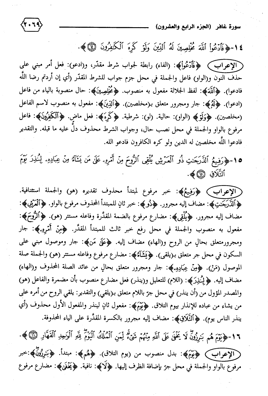 الإعراب {فَادْعُوا}: (الفاء) رابطة لجواب شرط مقدّر، و (ادعوا): فعل أمر مبني على حذف النون و (الواو) فاعل والجملة في محل جزم جواب للشرط المقدّر (أي إن أردتم رضا الله فادعوا.) {اللهَ}: لفظ الجلالة مفعول به منصوب. {مُخْلِصِينَ}: حال منصوبة بالياء من فاعل (ادعوا). {لَهُ}: جار ومجرور متعلق ب (مخلصين). {الدِّينَ}: مفعول به منصوب لاسم الفاعل (مخلصين). {وَلَوْ} (الواو): حالية. (لو): شرطية. {كَرِهَ}: فعل ماض. {الْكافِرُونَ}: فاعل مرفوع بالواو والجملة في محل نصب حال، وجواب الشرط محذوف دلّ عليه ما قبله. والتقدير فادعوا الله مخلصين له الدين ولو كره الكافرون فادعوا الله.