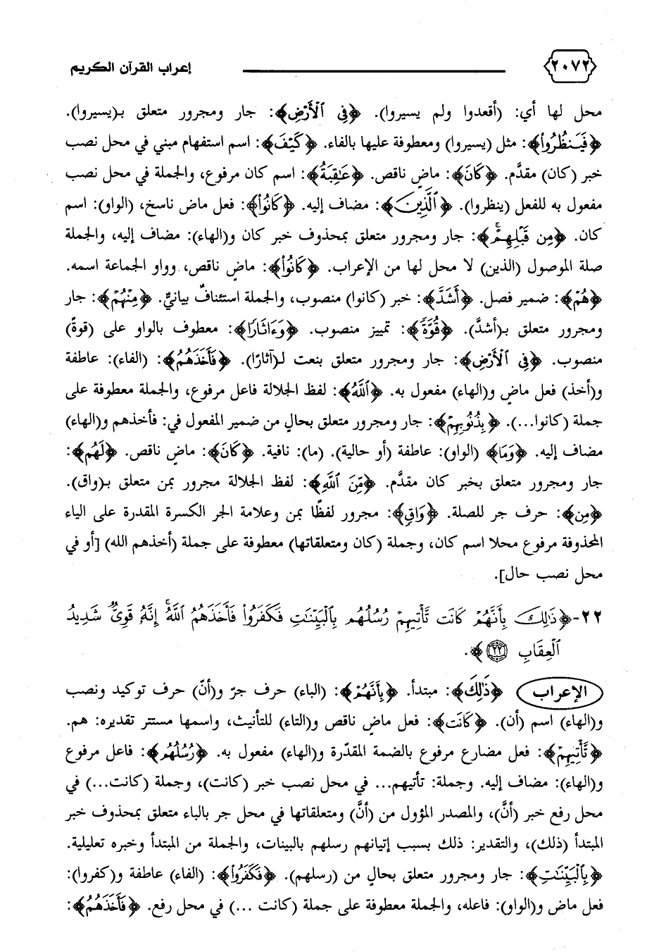 {هُمْ}: ضمير فصل. {أَشَدَّ}: خبر (كانوا) منصوب، والجملة استئناف بيانيّ. {مِنْهُمْ}: جار ومجرور متعلق ب (أشدّ). {قُوَّةً}: تمييز منصوب. {وَآثاراً}: معطوف بالواو على (قوة) منصوب. {فِي الْأَرْضِ}: جار ومجرور متعلق بنعت ل (آثارا). {فَأَخَذَهُمُ}: (الفاء): عاطفة و (أخذ) فعل ماض و (الهاء) مفعول به. {اللهُ}: لفظ الجلالة فاعل مرفوع، والجملة معطوفة على جملة (كانوا ... ) {بِذُنُوبِهِمْ}: جار ومجرور متعلق بحال من ضمير المفعول في: فأخذهم و (الهاء) مضاف إليه. {وَما} (الواو): عاطفة (أو حالية). (ما): نافية. {كانَ}: ماض ناقص. {لَهُمْ}: