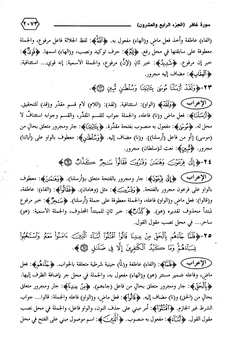 الإعراب {إِلى فِرْعَوْنَ}: جار ومجرور بالفتحة متعلق ب (أرسلنا). {وَهامانَ}: معطوف بالواو على فرعون مجرور بالفتحة. {وَقارُونَ}: مثل (وهامان). {فَقالُوا}: (الفاء): عاطفة، و (قالوا): فعل ماض و (الواو) فاعله، والجملة معطوفة على جملة (أرسلنا). {ساحِرٌ}: خبر مرفوع لمبتدإ محذوف تقديره (هو). {كَذّابٌ}: خبر ثان للمبتدإ المحذوف، والجملة الاسمية: (هو) ساحر ... في محل نصب مقول القول.