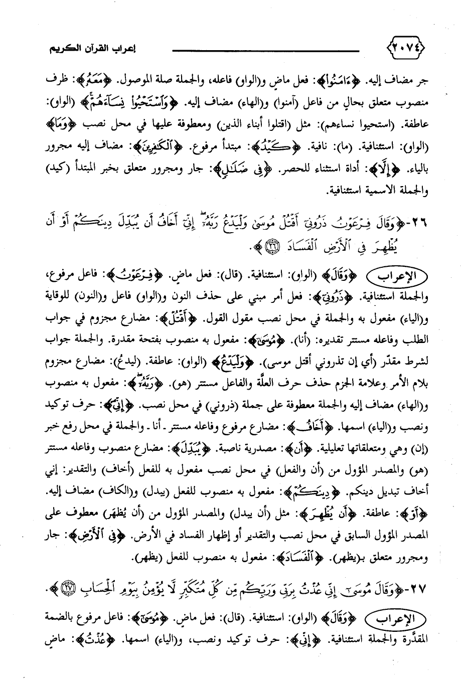 الإعراب {وَقالَ} (الواو): استئنافية. (قال): فعل ماض. {فِرْعَوْنُ}: فاعل مرفوع، والجملة استئنافية. {ذَرُونِي}: فعل أمر مبني على حذف النون و (الواو) فاعل و (النون) للوقاية و (الياء) مفعول به والجملة في محل نصب مقول القول. {أَقْتُلْ}: مضارع مجزوم في جواب الطلب وفاعله مستتر تقديره: (أنا). {مُوسى}: مفعول به منصوب بفتحة مقدرة. والجملة جواب لشرط مقدّر (أي إن تذروني أقتل موسى). {وَلْيَدْعُ} (الواو): عاطفة. (ليدع): مضارع مجزوم بلام الأمر وعلامة الجزم حذف حرف العلّة والفاعل مستتر (هو). {رَبَّهُ}: مفعول به منصوب و (الهاء) مضاف إليه والجملة معطوفة على جملة (ذروني) في محل نصب. {إِنِّي}: حرف توكيد ونصب و (الياء) اسمها. {أَخافُ}: مضارع مرفوع وفاعله مستتر-أنا-والجملة في محل رفع خبر (إن) وهي ومتعلقاتها تعليلية. {أَنْ}: مصدرية ناصبة. {يُبَدِّلَ}: مضارع منصوب وفاعله مستتر (هو) والمصدر المؤول من (أن والفعل) في محل نصب مفعول به للفعل (أخاف) والتقدير: إني أخاف تبديل دينكم. {دِينَكُمْ}: مفعول به منصوب للفعل (يبدل) و (الكاف) مضاف إليه.