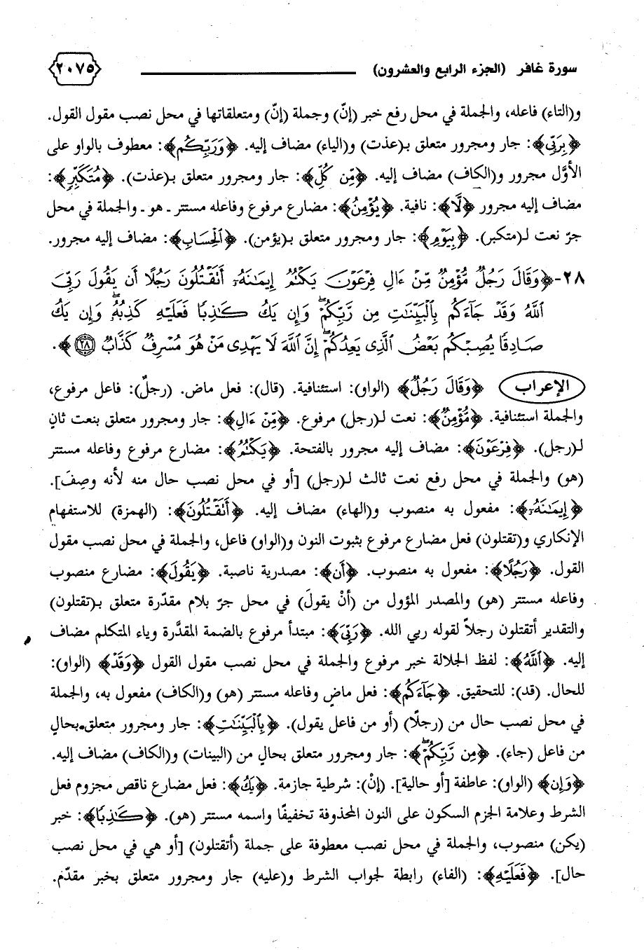 الإعراب {وَقالَ رَجُلٌ} (الواو): استئنافية: (قال): فعل ماض. (رجل): فاعل مرفوع، والجملة استئنافية. {مُؤْمِنٌ}: نعت ل (رجل) مرفوع. {مِنْ آلِ}: جار ومجرور متعلق بنعت ثان ل (رجل). {فِرْعَوْنَ}: مضاف إليه مجرور بالفتحة. {يَكْتُمُ}: مضارع مرفوع وفاعله مستتر (هو) والجملة في محل رفع نعت ثالث ل (رجل) [أو في محل نصب حال منه لأنه وصف].
