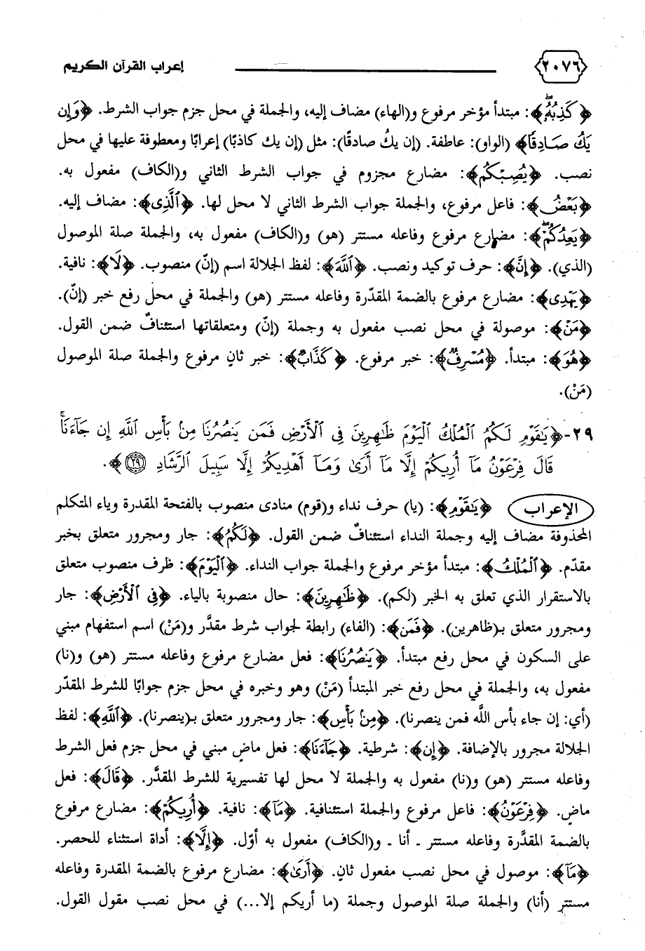 الإعراب {يا قَوْمِ}: (يا) حرف نداء و (قوم) منادى منصوب بالفتحة المقدرة وياء المتكلم المحذوفة مضاف إليه وجملة النداء استئناف ضمن القول. {لَكُمُ}: جار ومجرور متعلق بخبر مقدّم. {الْمُلْكُ}: مبتدأ مؤخر مرفوع والجملة جواب النداء. {الْيَوْمَ}: ظرف منصوب متعلق بالاستقرار الذي تعلق به الخبر (لكم). {ظاهِرِينَ}: حال منصوبة بالياء. {فِي الْأَرْضِ}: جار ومجرور متعلق ب (ظاهرين). {فَمَنْ}: (الفاء) رابطة لجواب شرط مقدّر و (من) اسم استفهام مبني على السكون في محل رفع مبتدأ. {يَنْصُرُنا}: فعل مضارع مرفوع وفاعله مستتر (هو) و (نا) مفعول به، والجملة في محل رفع خبر المبتدأ (من) وهو وخبره في محل جزم جوابا للشرط المقدّر (أي: إن جاء بأس الله فمن ينصرنا). {مِنْ بَأْسِ}: جار ومجرور متعلق ب (ينصرنا). {اللهِ}: لفظ الجلالة مجرور بالإضافة. {إِنْ}: شرطية. {جاءَنا}: فعل ماض مبني في محل جزم فعل الشرط وفاعله مستتر (هو) و (نا) مفعول به والجملة لا محل لها تفسيرية للشرط المقدّر. {قالَ}: فعل ماض. {فِرْعَوْنُ}: فاعل مرفوع والجملة استئنافية. {ما}: نافية. {أُرِيكُمْ}: مضارع مرفوع بالضمة المقدّرة وفاعله مستتر-أنا-و (الكاف) مفعول به أوّل. {إِلاّ}: أداة استثناء للحصر.