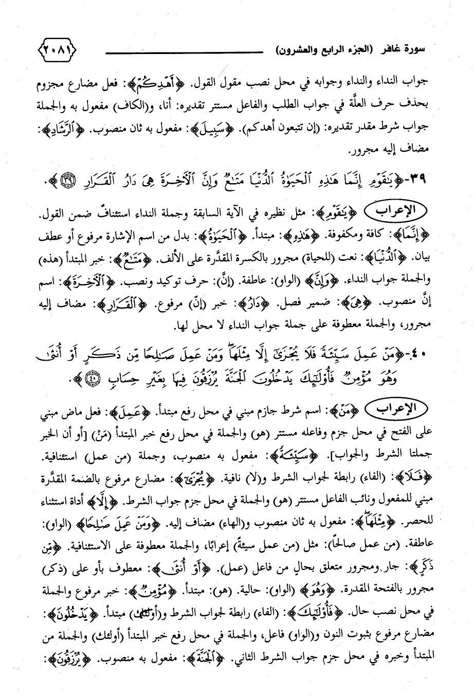 {إِنَّما}: كافة ومكفوفة. {هذِهِ}: مبتدأ. {الْحَياةُ}: بدل من اسم الإشارة مرفوع أو عطف بيان. {الدُّنْيا}: نعت (للحياة) مجرور بالكسرة المقدّرة على الألف. {مَتاعٌ}: خبر المبتدأ (هذه) والجملة جواب النداء. {وَإِنَّ} (الواو): عاطفة. (إنّ): حرف توكيد ونصب. {الْآخِرَةَ}: اسم إنّ منصوب. {هِيَ}: ضمير فصل. {دارُ}: خبر (إنّ) مرفوع. {الْقَرارِ}: مضاف إليه مجرور، والجملة معطوفة على جملة جواب النداء لا محل لها.