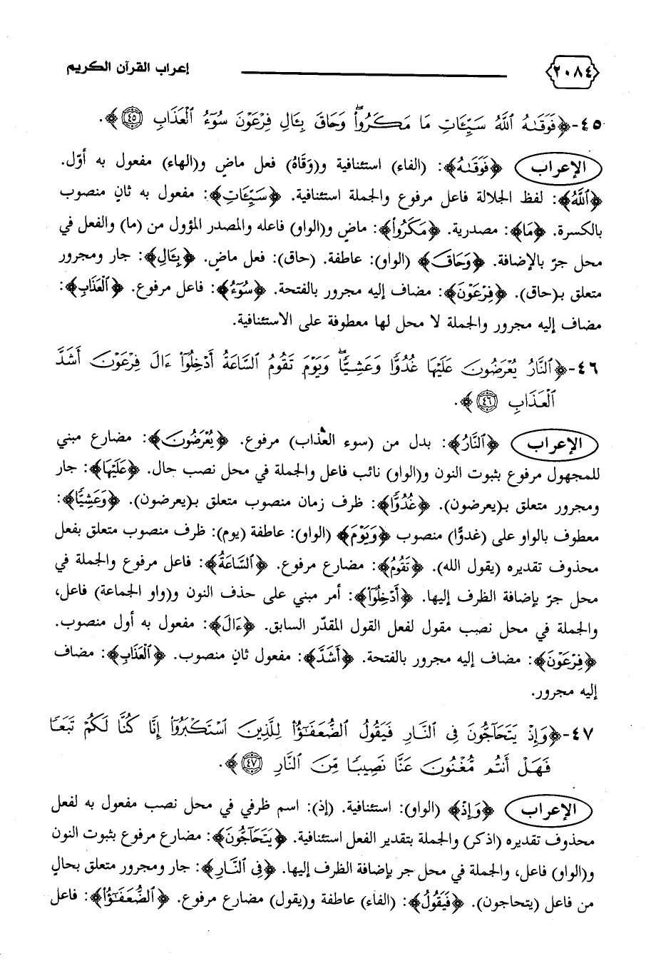 {اللهُ}: لفظ الجلالة فاعل مرفوع والجملة استئنافية. {سَيِّئاتِ}: مفعول به ثان منصوب بالكسرة. {ما}: مصدرية. {مَكَرُوا}: ماض و (الواو) فاعله والمصدر المؤول من (ما) والفعل في محل جرّ بالإضافة. {وَحاقَ} (الواو): عاطفة. (حاق): فعل ماض. {بِآلِ}: جار ومجرور متعلق ب (حاق). {فِرْعَوْنَ}: مضاف إليه مجرور بالفتحة. {سُوءُ}: فاعل مرفوع. {الْعَذابِ}: