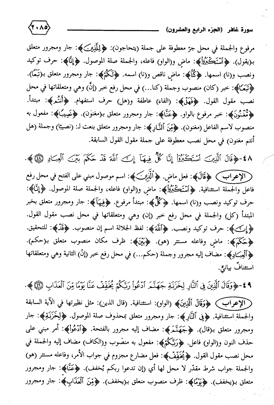 الإعراب {وَقالَ الَّذِينَ} (الواو): استئنافية. (قال الذين): مثل نظيرتها في الآية السابقة والجملة استئنافية. {فِي النّارِ}: جار ومجرور متعلق بمحذوف صلة الموصول. {لِخَزَنَةِ}: جار ومجرور متعلق ب (قال). {جَهَنَّمَ}: مضاف إليه مجرور بالفتحة. {اُدْعُوا}: أمر مبني على حذف النون و (الواو) فاعل. {رَبَّكُمْ}: مفعول به منصوب و (الكاف) مضاف إليه والجملة في محل نصب مقول القول. {يُخَفِّفْ}: فعل مضارع مجزوم في جواب الأمر، وفاعله مستتر (هو) والجملة جواب شرط مقدّر لا محل لها أي (إن تدعوا ربكم يخفف). {عَنّا}: جار ومجرور متعلق ب (يخفف). {يَوْماً}: ظرف منصوب متعلق ب (يخفف). {مِنَ الْعَذابِ}: جار ومجرور