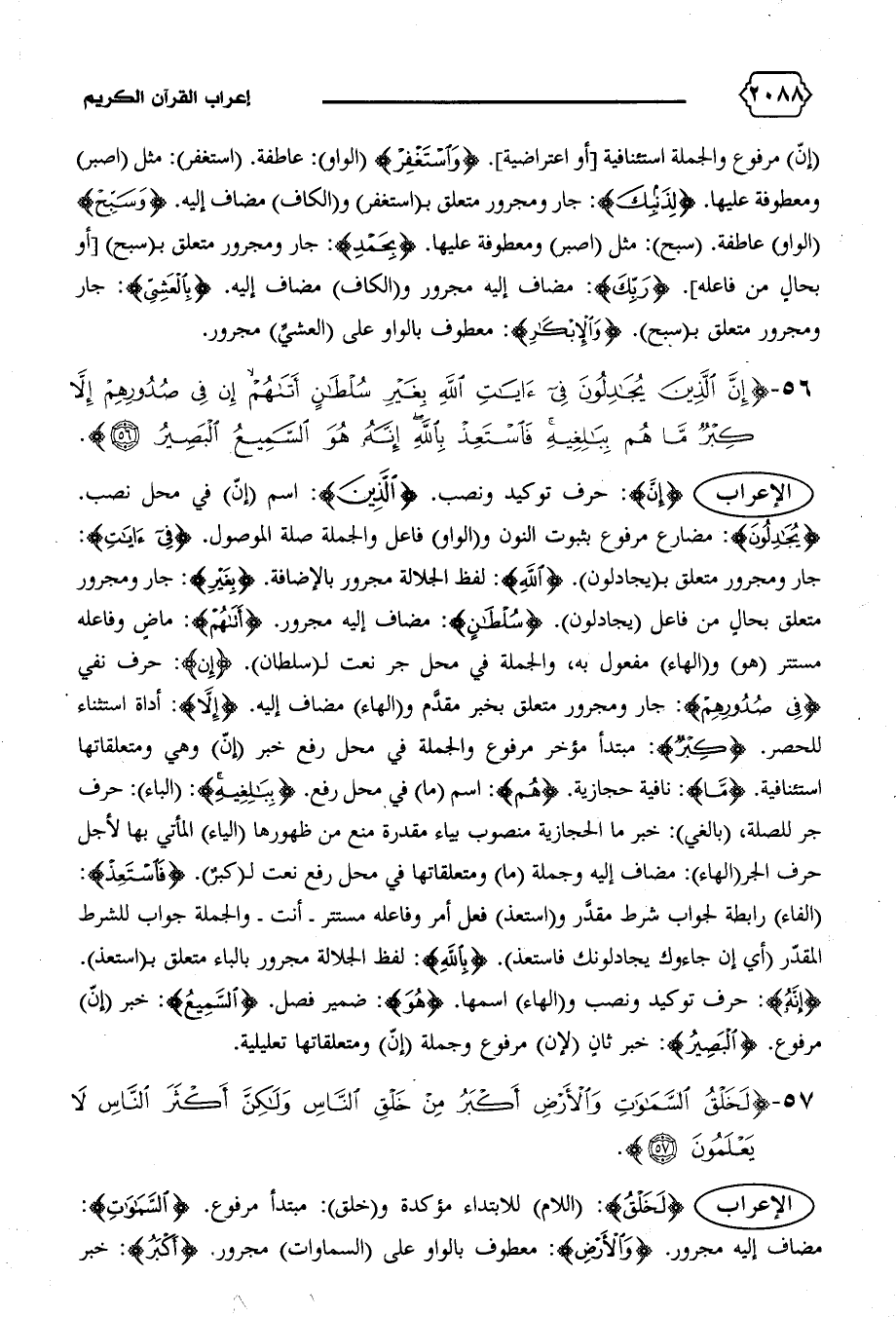 جار ومجرور متعلق ب (يجادلون). {اللهِ}: لفظ الجلالة مجرور بالإضافة. {بِغَيْرِ}: جار ومجرور متعلق بحال من فاعل (يجادلون). {سُلْطانٍ}: مضاف إليه مجرور. {أَتاهُمْ}: ماض وفاعله مستتر (هو) و (الهاء) مفعول به، والجملة في محل جر نعت ل (سلطان). {إِنَّ}: حرف نفي {فِي صُدُورِهِمْ}: جار ومجرور متعلق بخبر مقدّم و (الهاء) مضاف إليه. {إِلاّ}: أداة استثناء للحصر. {كِبْرٌ}: مبتدأ مؤخر مرفوع والجملة في محل رفع خبر (إنّ) وهي ومتعلقاتها استئنافية. {ما}: نافية حجازية. {هُمْ}: اسم (ما) في محل رفع. {بِبالِغِيهِ}: (الباء): حرف جر للصلة، (بالغي): خبر ما الحجازية منصوب بياء مقدرة منع من ظهورها (الياء) المأتي بها لأجل حرف الجر (الهاء): مضاف إليه وجملة (ما) ومتعلقاتها في محل رفع نعت ل (كبر). {فَاسْتَعِذْ}: