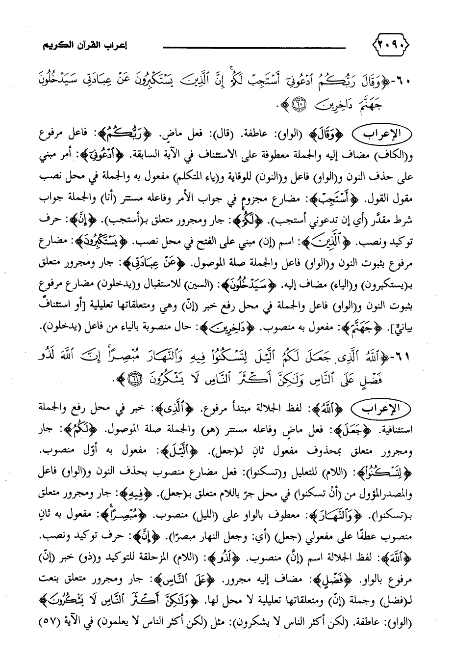 الإعراب {وَقالَ} (الواو): عاطفة. (قال): فعل ماض. {رَبُّكُمُ}: فاعل مرفوع و (الكاف) مضاف إليه والجملة معطوفة على الاستئناف في الآية السابقة. {اُدْعُونِي}: أمر مبني على حذف النون و (الواو) فاعل و (النون) للوقاية و (ياء المتكلم) مفعول به والجملة في محل نصب مقول القول. {أَسْتَجِبْ}: مضارع مجزوم في جواب الأمر وفاعله مستتر (أنا) والجملة جواب شرط مقدّر (أي إن تدعوني أستجب). {لَكُمْ}: جار ومجرور متعلق ب (أستجب). {إِنَّ}: حرف توكيد ونصب. {الَّذِينَ}: اسم (إن) مبني على الفتح في محل نصب. {يَسْتَكْبِرُونَ}: مضارع مرفوع بثبوت النون و (الواو) فاعل والجملة صلة الموصول. {عَنْ عِبادَتِي}: جار ومجرور متعلق ب (يستكبرون) و (الياء) مضاف إليه. {سَيَدْخُلُونَ}: (السين) للاستقبال و (يدخلون) مضارع مرفوع بثبوت النون و (الواو) فاعل والجملة في محل رفع خبر (إنّ) وهي ومتعلقاتها تعليلية [أو استئناف بيانيّ]. {جَهَنَّمَ}: مفعول به منصوب. {داخِرِينَ}: حال منصوبة بالياء من فاعل (يدخلون).
