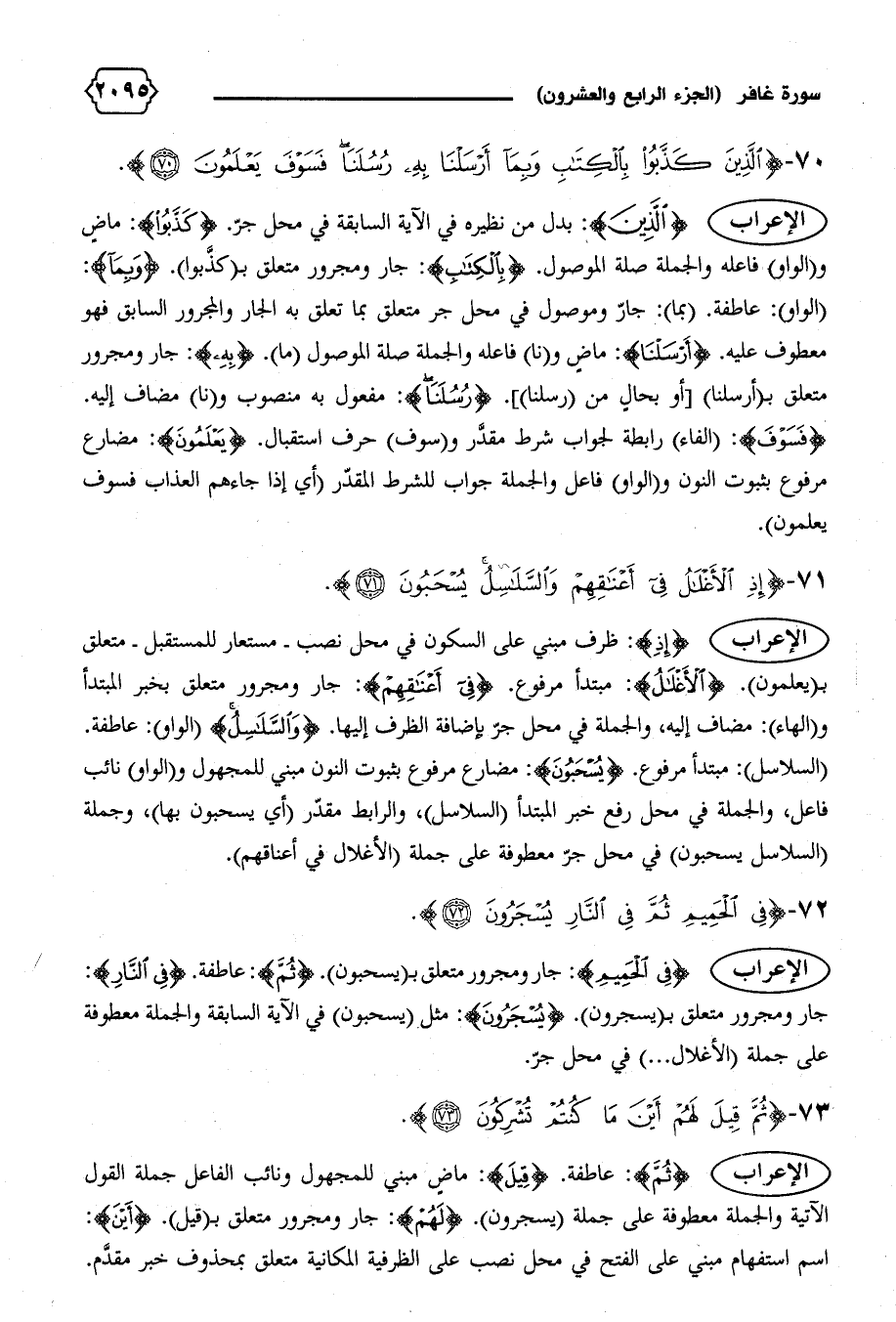 الإعراب {إِذِ}: ظرف مبني على السكون في محل نصب-مستعار للمستقبل-متعلق ب (يعلمون). {الْأَغْلالُ}: مبتدأ مرفوع. {فِي أَعْناقِهِمْ}: جار ومجرور متعلق بخبر المبتدأ و (الهاء): مضاف إليه، والجملة في محل جرّ بإضافة الظرف إليها. {وَالسَّلاسِلُ} (الواو): عاطفة.