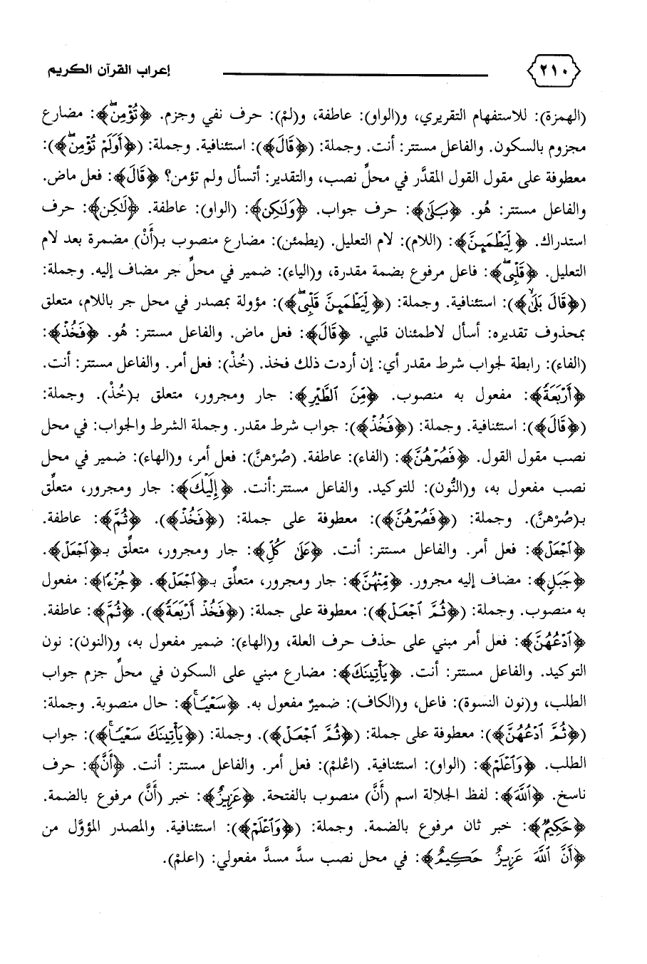 والفاعل مستتر: هو. {بَلى}: حرف جواب. {وَلكِنْ}: (الواو): عاطفة. {لكِنْ}: حرف استدراك. {لِيَطْمَئِنَّ}: (اللام): لام التعليل. (يطمئن): مضارع منصوب ب (أن) مضمرة بعد لام التعليل. {قَلْبِي}: فاعل مرفوع بضمة مقدرة، و (الياء): ضمير في محلّ جر مضاف إليه. وجملة: