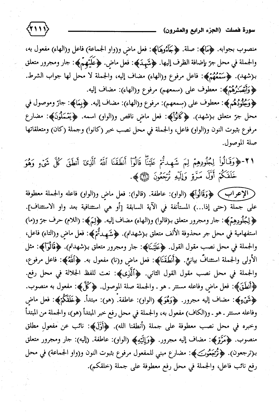 {وَجُلُودُهُمْ}: معطوف على (سمعهم): مرفوع و (الهاء): مضاف إليه. {بِما}: جارّ وموصول في محل جرّ متعلق ب (شهد). {كانُوا}: فعل ماض ناقص و (الواو) اسمه. {يَعْمَلُونَ}: مضارع مرفوع بثبوت النون و (الواو) فاعل، والجملة في محل نصب خبر (كانوا) وجملة (كان) ومتعلقاتها صلة الموصول.