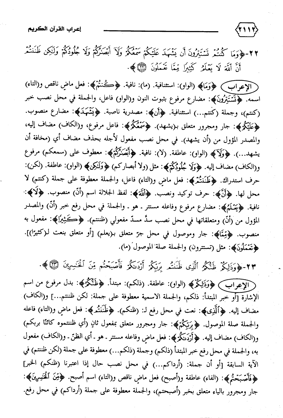 الإعراب {وَذلِكُمْ} (الواو): عاطفة. (ذلكم): مبتدأ. {ظَنُّكُمُ}: بدل مرفوع من اسم الإشارة [أو خبر المبتدأ: ذلكم، والجملة الاسمية معطوفة على جملة: لكن ظننتم ... ] و (الكاف) مضاف إليه. {الَّذِي}: نعت في محل رفع ل: (ظنكم). {ظَنَنْتُمْ}: فعل ماض و (التاء) فاعله والجملة صلة الموصول. {بِرَبِّكُمْ}: جار ومجرور متعلق بمفعول ثان (أي ظننتموه كائنا بربكم) و (الكاف) مضاف إليه. {أَرْداكُمْ}: فعل ماض وفاعله مستتر-هو-أي الظنّ-و (الكاف) مفعول به، والجملة في محل رفع خبر المبتدأ (ذلكم) وجملة (ذلكم ... ) معطوفة على جملة (لكن ظننتم) في الآية السابقة [أو أن جملة: (أرداكم ... ) في محل نصب حال إذا اعتبرنا (ظنكم) الخبر] {فَأَصْبَحْتُمْ}: (الفاء) عاطفة و (أصبح) فعل ماض ناقص و (التاء) اسم أصبح. {مِنَ الْخاسِرِينَ}: