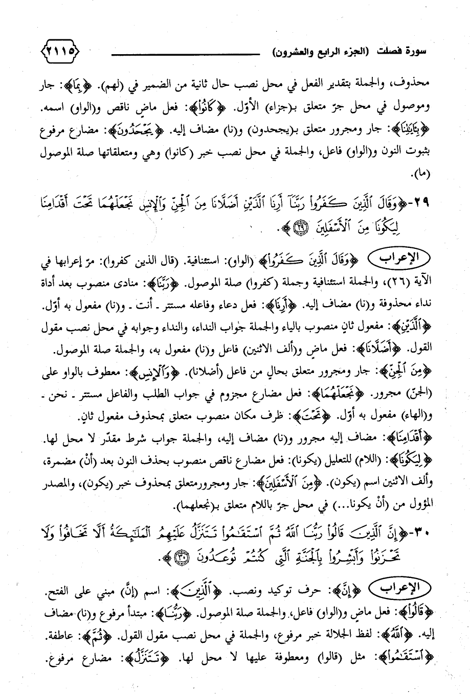 الإعراب {وَقالَ الَّذِينَ كَفَرُوا} (الواو): استئنافية. (قال الذين كفروا): مرّ إعرابها في الآية (٢٦)، والجملة استئنافية وجملة (كفروا) صلة الموصول. {رَبَّنا}: منادى منصوب بعد أداة نداء محذوفة و (نا) مضاف إليه. {أَرِنَا}: فعل دعاء وفاعله مستتر-أنت-و (نا) مفعول به أوّل.