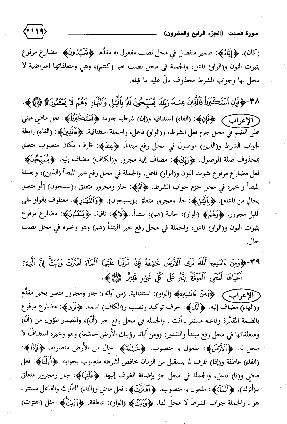 الإعراب {فَإِنِ}: (الفاء) استئنافية و (إن) شرطية جازمة {اِسْتَكْبَرُوا}: فعل ماض مبني على الضم في محل جزم فعل الشرط، و (الواو) فاعل، والجملة استئنافية. {فَالَّذِينَ}: (الفاء) رابطة لجواب الشرط و (الذين) موصول في محل رفع مبتدأ. {عِنْدَ}: ظرف مكان منصوب متعلق بمحذوف صلة الموصول. {رَبِّكَ}: مضاف إليه مجرور و (الكاف) مضاف إليه. {يُسَبِّحُونَ}: