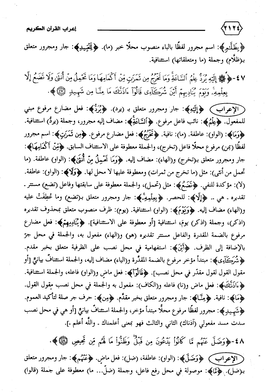 (لا): مؤكدة للنفي. {تَضَعُ}: مثل (تحمل)، والجملة معطوفة على سابقتها وفاعل (تضع) مستتر- تقديره-هي .. {إِلاّ}: للحصر. {بِعِلْمِهِ}: جار ومجرور متعلق ب (تضع) وما عطفت عليه و (الهاء) مضاف إليه. {وَيَوْمَ}: (الواو) استئنافية. (يوم): ظرف منصوب متعلق بمحذوف تقديره (اذكر)، وجملة (اذكر) يوم، استئنافية [أو معطوفة على الاستئنافية]. {يُنادِيهِمْ}: فعل مضارع مرفوع بالضمة المقدرة والفاعل مستتر تقديره (هو) و (الهاء) مفعول به، والجملة في محل جرّ بالإضافة إلى الظرف. {أَيْنَ}: استفهامية في محل نصب على الظرفية متعلق بخبر مقدم.