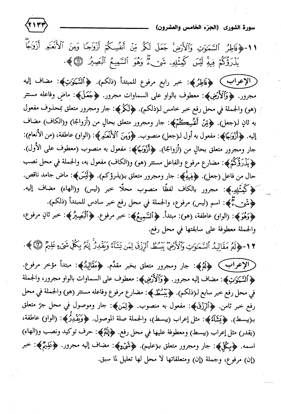 {السَّماواتِ}: مضاف إليه مجرور. {وَالْأَرْضِ}: معطوف على السماوات بالواو مجرور، والجملة في محل رفع خبر سابع ل (ذلكم). {يَبْسُطُ}: مضارع مرفوع وفاعله مستتر (هو) والجملة في محل رفع خبر ثامن. {الرِّزْقَ}: مفعول به منصوب. {لِمَنْ}: جار وموصول في محل جرّ متعلق ب (يبسط). {يَشاءُ}: مثل إعراب (يبسط)، والجملة صلة الموصول. {وَيَقْدِرُ}: (الواو) عاطفة، (يقدر) مثل إعراب (يبسط) ومعطوفة عليها في محل رفع. {إِنَّهُ}: حرف توكيد ونصب و (الهاء) اسمه. {بِكُلِّ}: جار ومجرور متعلق ب (عليم). {شَيْءٍ}: مضاف إليه مجرور. {عَلِيمٌ}: خبر (إن) مرفوع، وجملة (إن) ومتعلقاتها لا محل لها تعليل لما سبق.