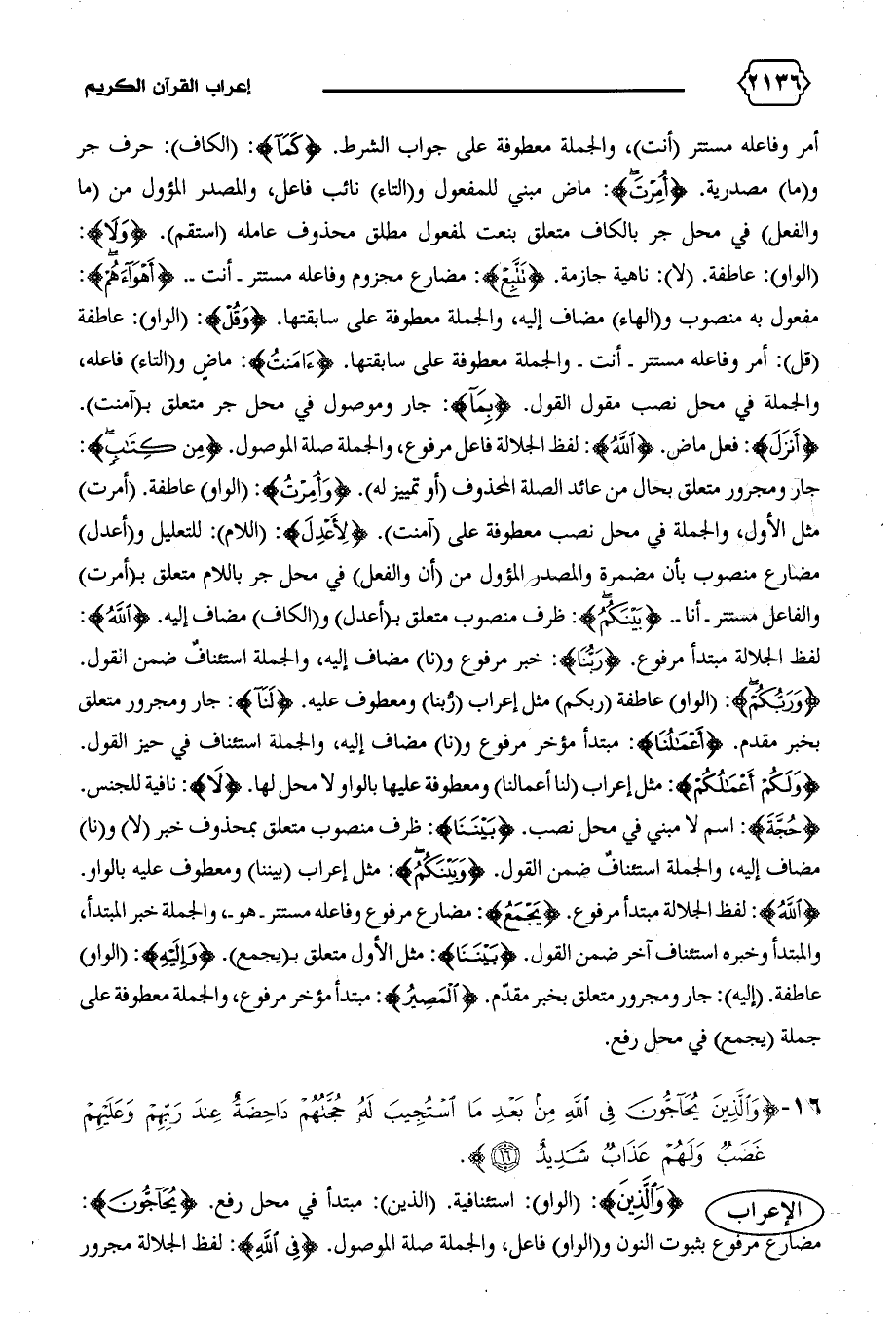 جار ومجرور متعلق بحال من عائد الصلة المحذوف (أو تمييز له). {وَأُمِرْتُ}: (الواو) عاطفة. (أمرت) مثل الأول، والجملة في محل نصب معطوفة على (آمنت). {لِأَعْدِلَ}: (اللام): للتعليل و (أعدل) مضارع منصوب بأن مضمرة والمصدر المؤول من (أن والفعل) في محل جر باللام متعلق ب (أمرت) والفاعل مستتر-أنا ... {بَيْنَكُمُ}: ظرف منصوب متعلق ب (أعدل) و (الكاف) مضاف إليه. {اللهُ}: