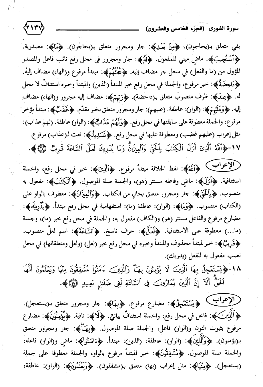 الإعراب {اللهُ}: لفظ الجلالة مبتدأ مرفوع. {الَّذِي}: خبر في محل رفع، والجملة استئنافية. {أَنْزَلَ}: ماض وفاعله مستتر (هو)، والجملة صلة الموصول. {الْكِتابَ}: مفعول به منصوب. {بِالْحَقِّ}: جار ومجرور متعلق بحال من الكتاب. {وَالْمِيزانَ}: معطوف بالواو على (الكتاب) منصوب. {وَما}: (الواو): عاطفة (ما): استفهامية في محل رفع مبتدأ. {يُدْرِيكَ}: