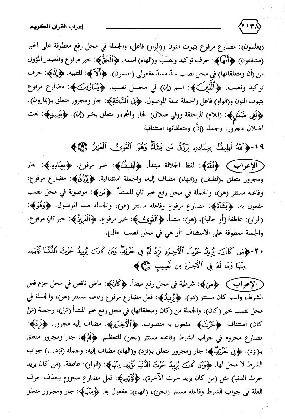 الإعراب {مَنْ}: شرطية في محل رفع مبتدأ. {كانَ}: ماض ناقص في محل جزم فعل الشرط، واسم كان مستتر (هو). {يُرِيدُ}: فعل مضارع مرفوع وفاعله مستتر (هو)، والجملة في محل نصب خبر (كان)، والجملة من (كان ومتعلقاتها) في محل رفع خبر المبتدأ (من)، وجملة (من كان) استئنافية. {حَرْثَ}: مفعول به منصوب. {الْآخِرَةِ}: مضاف إليه مجرور. {نَزِدْ}:
