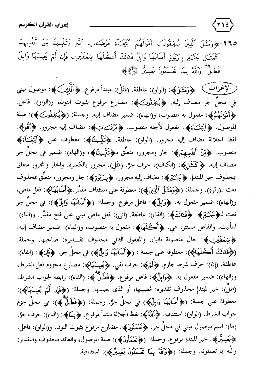 لفظ الجلالة مضاف إليه مجرور. (الواو): عاطفة. {تَثْبِيتاً}: معطوف على {اِبْتِغاءَ} منصوب. {مِنْ أَنْفُسِهِمْ}: جار ومجرور، متعلّق ب {تَثْبِيتاً،} و (الهاء): ضمير في محلّ جر مضاف إليه. {كَمَثَلِ}: (الكاف): حرف جرّ. (مثل): مجرور بالكسرة. والجار والمجرور متعلق بمحذوف خبر المبتدإ. {جَنَّةٍ}: مضاف إليه مجرور. {بِرَبْوَةٍ}: جار ومجرور، متعلّق بمحذوف نعت ل (ربوة).وجملة: {وَمَثَلُ الَّذِينَ}: معطوفة على استئناف مقدّر. {أَصابَها}: فعل ماض، و (الهاء): ضمير مفعول به. {وابِلٌ}: فاعل مرفوع. وجملة: {أَصابَها وابِلٌ}: في محلّ جر نعت ل {جَنَّةٍ}. {فَآتَتْ}: (الفاء): عاطفة. (آتى): فعل ماض مبني على فتح مقدّر. و (التاء):