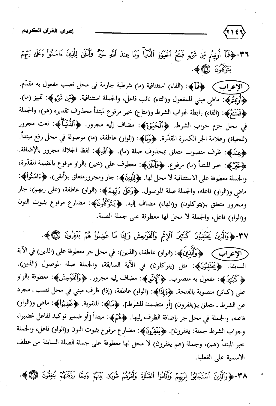 الإعراب {وَالَّذِينَ}: (الواو) عاطفة، (الذين): في محل جر معطوفة على (الذين) في الآية السابقة. {يَجْتَنِبُونَ}: مثل (يتوكلون) في الآية السابقة، والجملة صلة الموصول (الذين).
