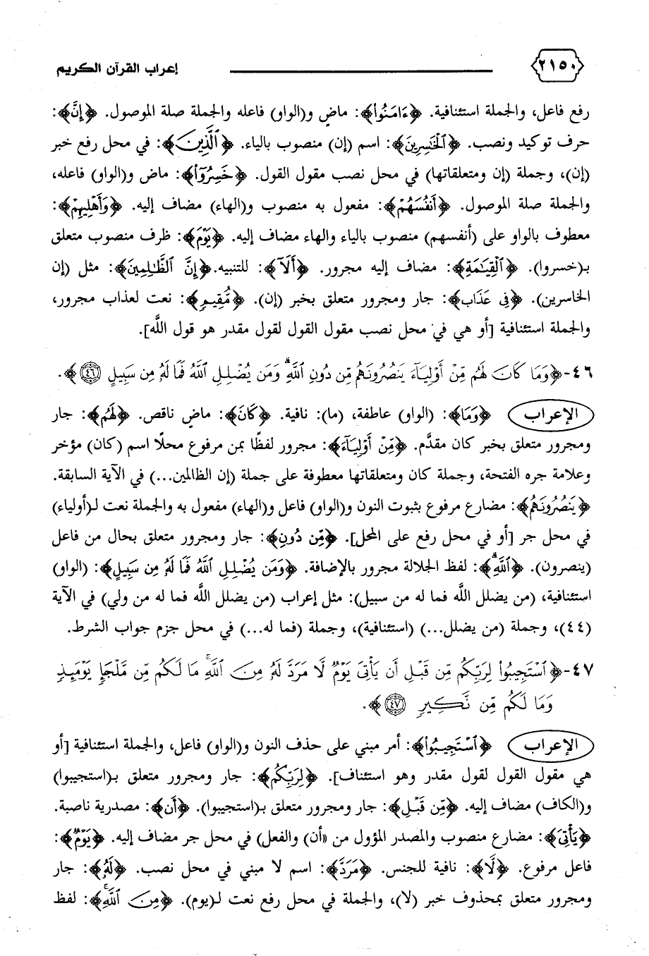 الإعراب {اِسْتَجِيبُوا}: أمر مبني على حذف النون و (الواو) فاعل، والجملة استئنافية [أو هي مقول القول لقول مقدر وهو استئناف]. {لِرَبِّكُمْ}: جار ومجرور متعلق ب (استجيبوا) و (الكاف) مضاف إليه. {مِنْ قَبْلِ}: جار ومجرور متعلق ب (استجيبوا). {أَنْ}: مصدرية ناصبة.