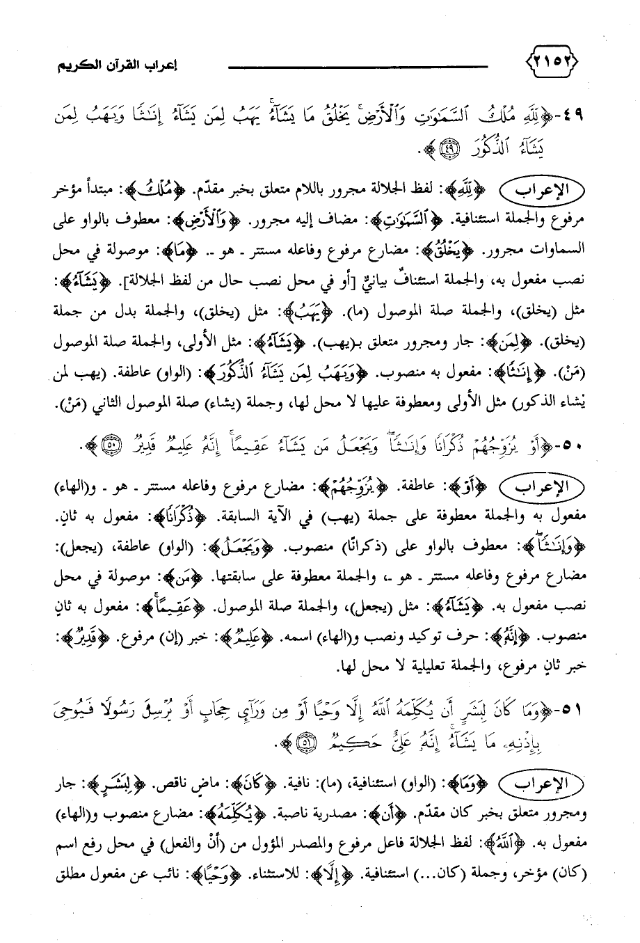 مثل (يخلق)، والجملة صلة الموصول (ما). {يَهَبُ}: مثل (يخلق)، والجملة بدل من جملة (يخلق). {لِمَنْ}: جار ومجرور متعلق ب (يهب). {يَشاءُ}: مثل الأولى، والجملة صلة الموصول (من). {إِناثاً}: مفعول به منصوب. {وَيَهَبُ لِمَنْ يَشاءُ الذُّكُورَ}: (الواو) عاطفة. (يهب لمن يشاء الذكور) مثل الأولى ومعطوفة عليها لا محل لها، وجملة (يشاء) صلة الموصول الثاني (من).