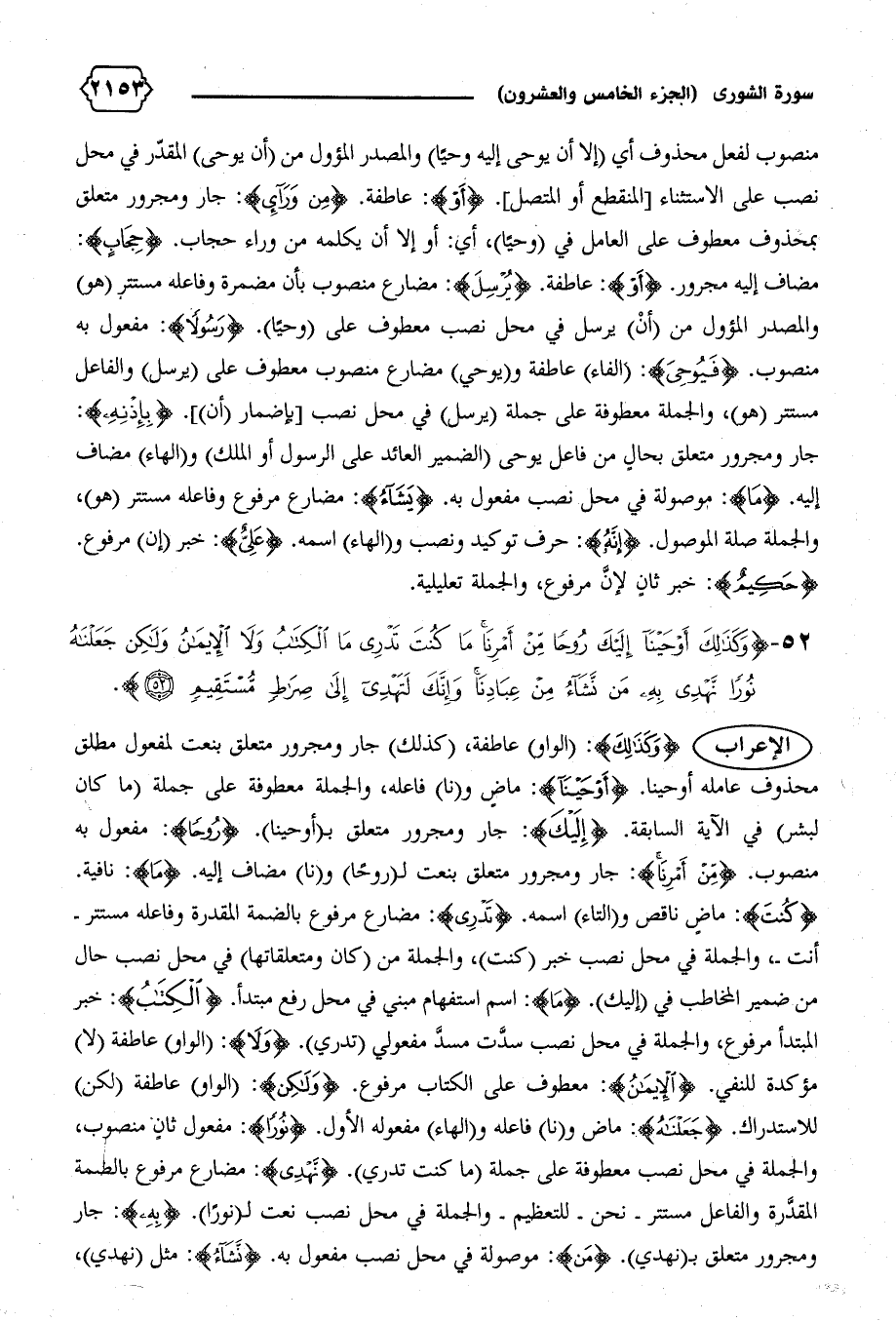 {كُنْتَ}: ماض ناقص و (التاء) اسمه. {تَدْرِي}: مضارع مرفوع بالضمة المقدرة وفاعله مستتر- أنت-، والجملة في محل نصب خبر (كنت)، والجملة من (كان ومتعلقاتها) في محل نصب حال من ضمير المخاطب في (إليك). {ما}: اسم استفهام مبني في محل رفع مبتدأ. {الْكِتابُ}: خبر المبتدأ مرفوع، والجملة في محل نصب سدّت مسدّ مفعولي (تدري). {وَلا}: (الواو) عاطفة (لا) مؤكدة للنفي. {الْإِيمانُ}: معطوف على الكتاب مرفوع. {وَلكِنْ}: (الواو) عاطفة (لكن) للاستدراك. {جَعَلْناهُ}: ماض و (نا) فاعله و (الهاء) مفعوله الأول. {نُوراً}: مفعول ثان منصوب، والجملة في محل نصب معطوفة على جملة (ما كنت تدري). {نَهْدِي}: مضارع مرفوع بالضمة المقدّرة والفاعل مستتر-نحن-للتعظيم-والجملة في محل نصب نعت ل (نورا). {بِهِ}: جار ومجرور متعلق ب (نهدي). {مِنْ}: موصولة في محل نصب مفعول به. {نَشاءُ}: مثل (نهدي)،