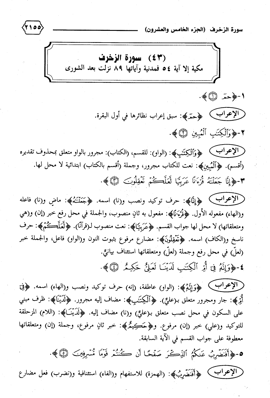 الإعراب {إِنّا}: حرف توكيد ونصب و (نا) اسمه. {جَعَلْناهُ}: ماض و (نا) فاعله و (الهاء) مفعوله الأول. {قُرْآناً}: مفعول به ثان منصوب، والجملة في محل رفع خبر (إن) و (هي ومتعلقاتها) لا محل لها جواب القسم. {عَرَبِيًّا}: نعت منصوب ل (قرآنا). {لَعَلَّكُمْ}: حرف ناسخ و (الكاف) اسمه. {تَعْقِلُونَ}: مضارع مرفوع بثبوت النون و (الواو) فاعل، والجملة خبر (لعلّ) في محل رفع وجملة (لعلّ) ومتعلقاتها استئناف بيانيّ.