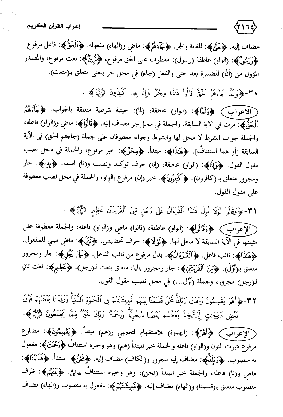 الإعراب {وَلَمّا}: (الواو) عاطفة، (لما): حينية شرطية متعلقة بالجواب. {جاءَهُمُ الْحَقُّ}: مرت في الآية السابقة، والجملة في محل جر مضاف إليه. {قالُوا}: ماض و (الواو) فاعله، والجملة جواب الشرط لا محل لها والشرط وجوابه معطوفان على جملة (جاءهم الحق) في الآية السابقة [أو هما استئناف]. {هذا}: مبتدأ. {سِحْرٌ}: خبر مرفوع، والجملة في محل نصب مقول القول. {وَإِنّا}: (الواو) عاطفة، (إنا) حرف توكيد ونصب و (نا) اسمه. {بِهِ}: جار ومجرور متعلق ب (كافرون). {كافِرُونَ}: خبر (إن) مرفوع بالواو، والجملة في محل نصب معطوفة على مقول القول.