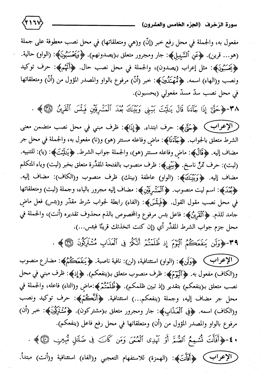 مفعول به، والجملة في محل رفع خبر (إنّ) و (هي ومتعلقاتها) في محل نصب معطوفة على جملة (هو ... قرين). {عَنِ السَّبِيلِ}: جار ومجرور متعلق ب (يصدونهم). {وَيَحْسَبُونَ}: (الواو) حالية.