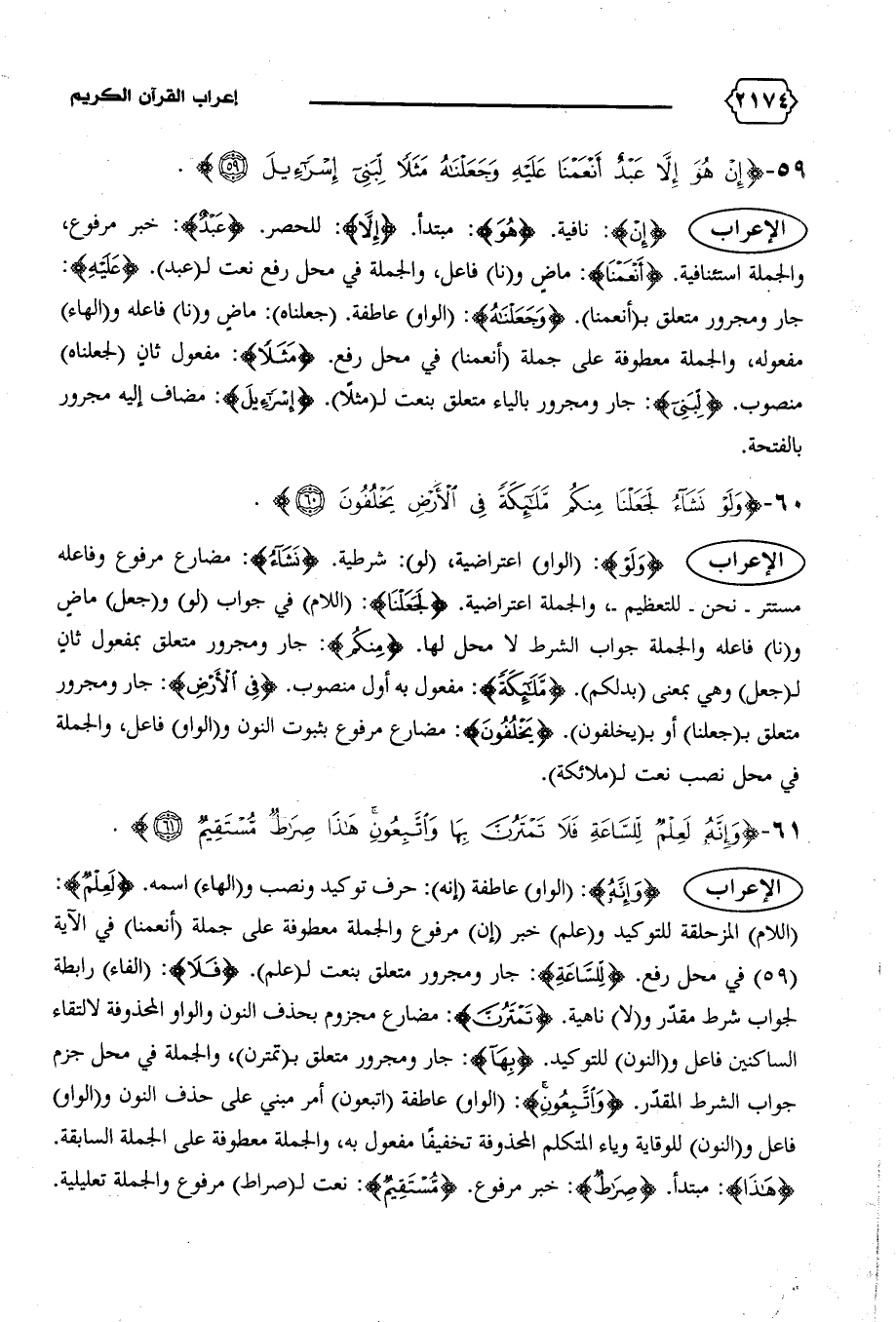 (اللام) المزحلقة للتوكيد و (علم) خبر (إن) مرفوع والجملة معطوفة على جملة (أنعمنا) في الآية (٥٩) في محل رفع. {لِلسّاعَةِ}: جار ومجرور متعلق بنعت ل (علم). {فَلا}: (الفاء) رابطة لجواب شرط مقدّر و (لا) ناهية. {تَمْتَرُنَّ}: مضارع مجزوم بحذف النون والواو المحذوفة لالتقاء الساكنين فاعل و (النون) للتوكيد. {بِها}: جار ومجرور متعلق ب (تمترن)، والجملة في محل جزم جواب الشرط المقدّر. {وَاتَّبِعُونِ}: (الواو) عاطفة (اتبعون) أمر مبني على حذف النون و (الواو) فاعل و (النون) للوقاية وياء المتكلم المحذوفة تخفيفا مفعول به، والجملة معطوفة على الجملة السابقة.