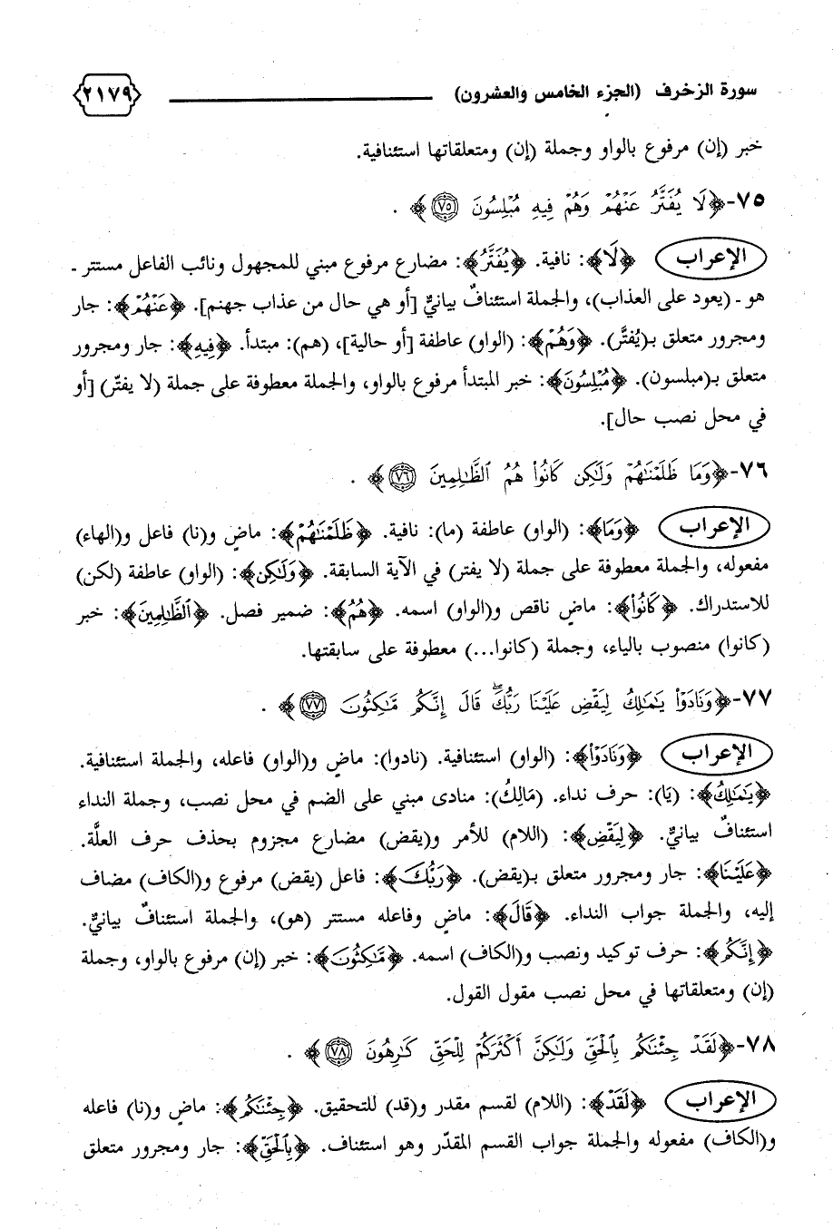 الإعراب {وَما}: (الواو) عاطفة (ما): نافية. {ظَلَمْناهُمْ}: ماض و (نا) فاعل و (الهاء) مفعوله، والجملة معطوفة على جملة (لا يفتر) في الآية السابقة. {وَلكِنْ}: (الواو) عاطفة (لكن) للاستدراك. {كانُوا}: ماض ناقص و (الواو) اسمه. {هُمُ}: ضمير فصل. {الظّالِمِينَ}: خبر (كانوا) منصوب بالياء، وجملة (كانوا ... ) معطوفة على سابقتها.