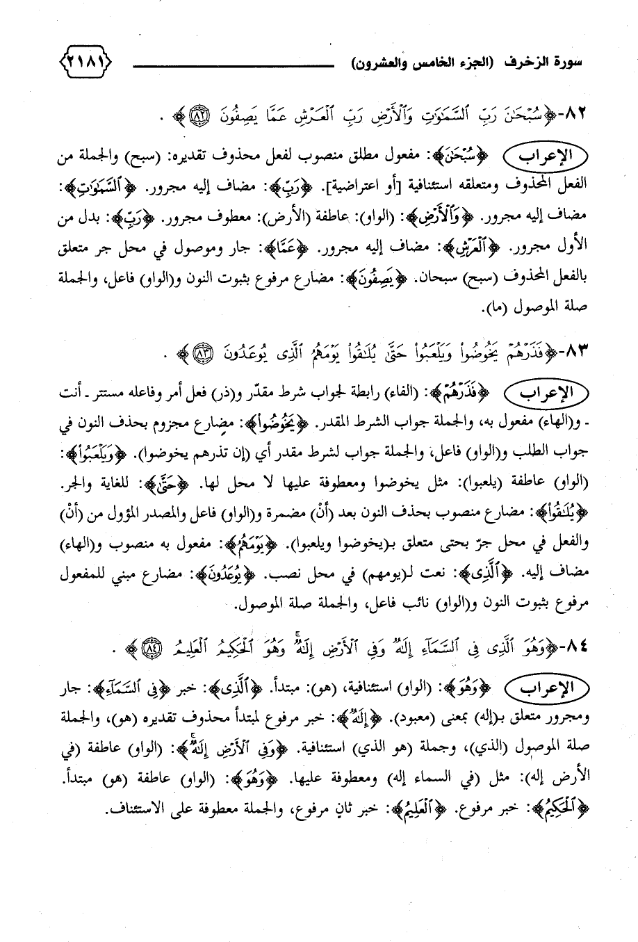 الإعراب {وَهُوَ}: (الواو) استئنافية. (هو): مبتدأ. {الَّذِي}: خبر {فِي السَّماءِ}: جار ومجرور متعلق ب (إله) بمعنى (معبود). {إِلهٌ}: خبر مرفوع لمبتدإ محذوف تقديره (هو)، والجملة صلة الموصول (الذي)، وجملة (هو الذي) استئنافية. {وَفِي الْأَرْضِ إِلهٌ}: (الواو) عاطفة (في الأرض إله): مثل (في السماء إله) ومعطوفة عليها. {وَهُوَ}: (الواو) عاطفة (هو) مبتدأ.