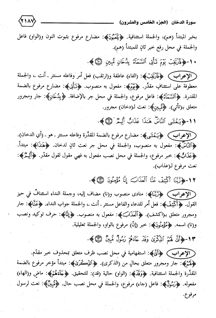 الإعراب {رَبَّنَا}: منادى منصوب و (نا) مضاف إليه، وجملة النداء استئناف في حيز القول. {اِكْشِفْ}: فعل أمر للدعاء والفاعل مستتر-أنت-، والجملة جواب النداء. {عَنَّا}: جار ومجرور متعلق ب (اكشف). {الْعَذابَ}: مفعول به منصوب. {إِنّا}: حرف توكيد ونصب و (نا) اسمه. {مُؤْمِنُونَ}: خبر (إنّ) مرفوع بالواو، والجملة تعليلية.